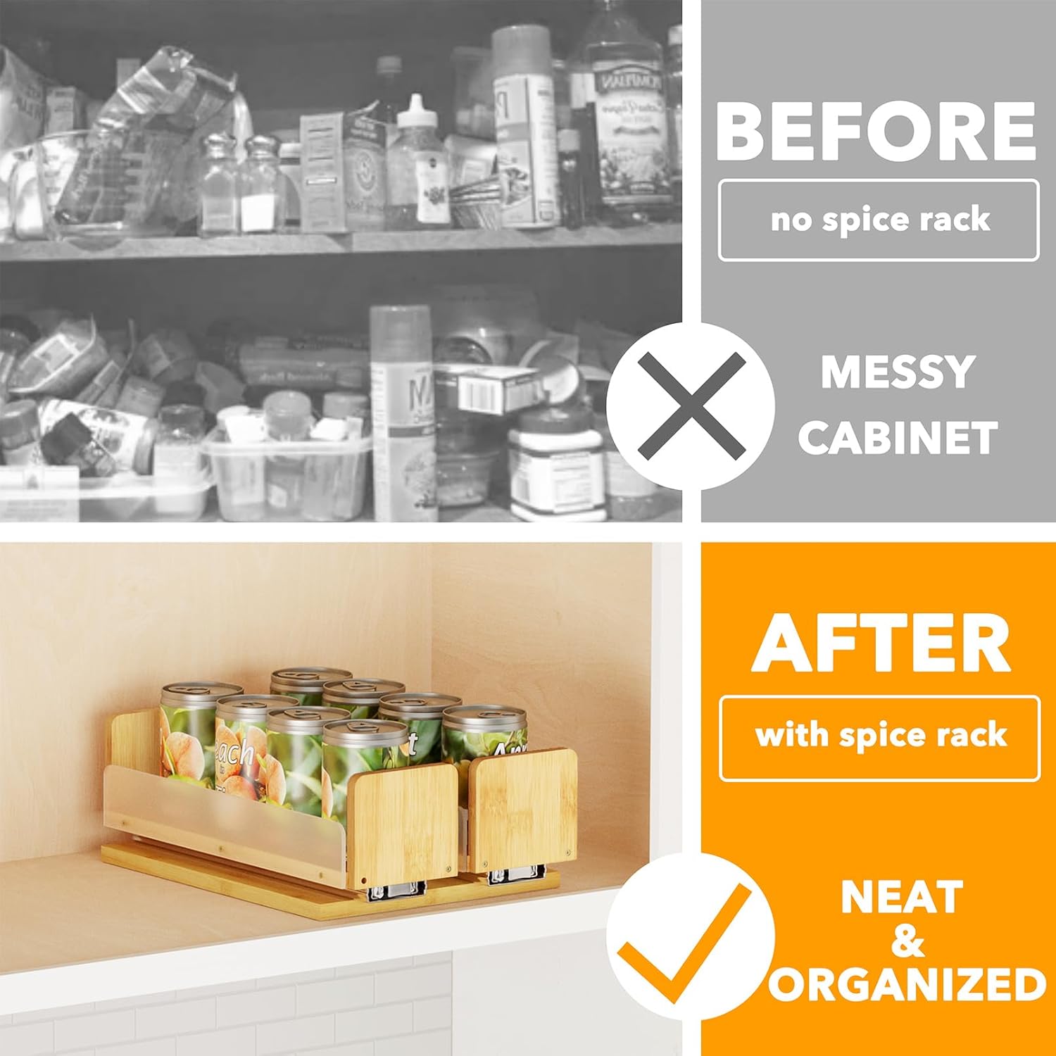 • DURABLE MATERIAL TO LAST - Crafted from premium quality bamboo, this slide out seasoning organizer is built for long-lasting use; Our space-saving spice rack complement your home storage system and maximize cabinet space efficiency