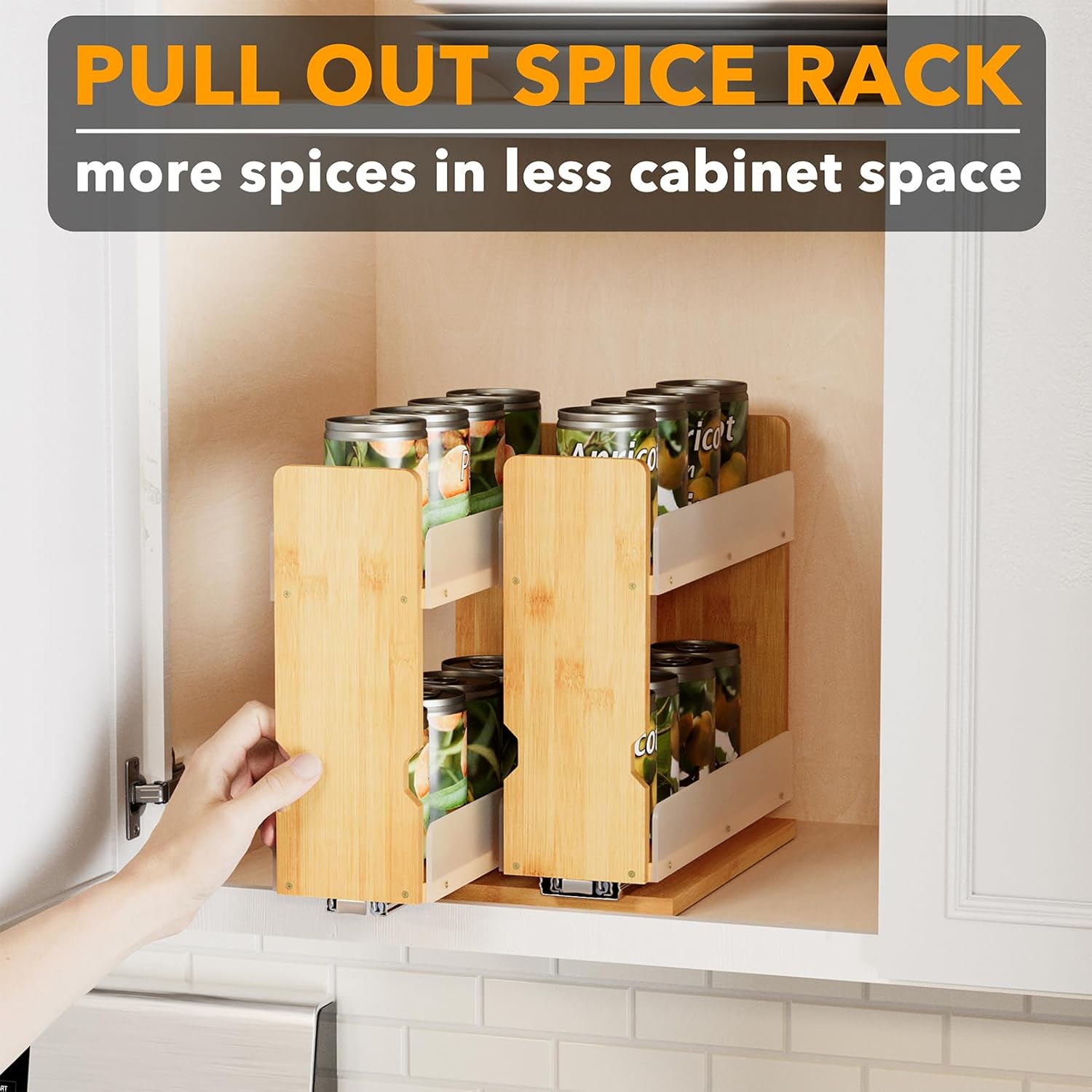 • MAXIMIZE SPICE STORAGE SPACE - The easy pull out spice rack organizer lets you store more spices in a compact area, keeping everything organized; Effortlessly access all your spices in your kitchen cabinet