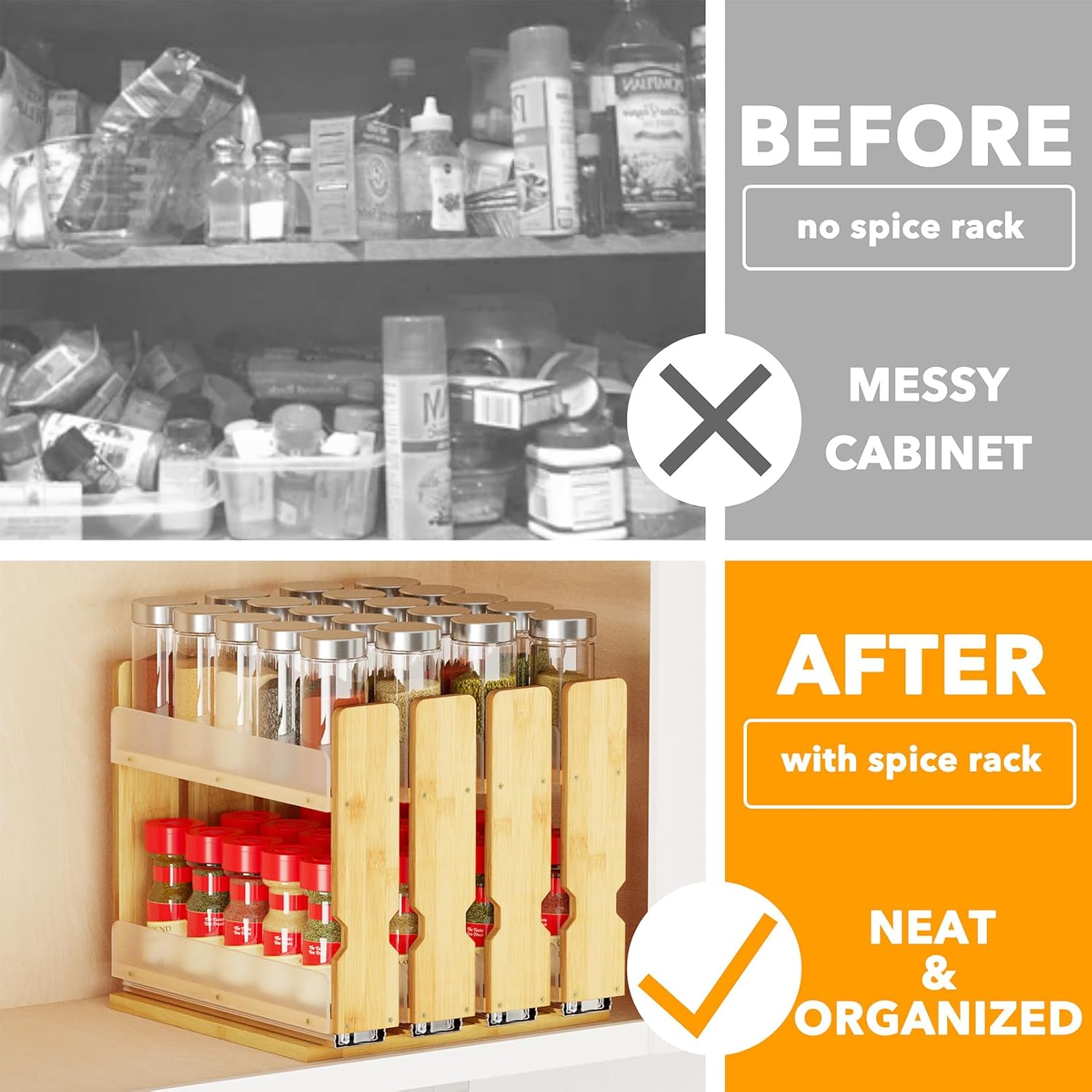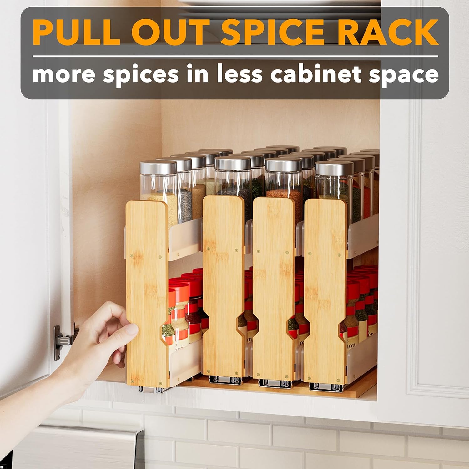 • MAXIMIZE SPICE STORAGE SPACE - The easy pull out spice rack organizer lets you store more spices in a compact area, keeping everything organized; Effortlessly access all your spices in your kitchen cabinet