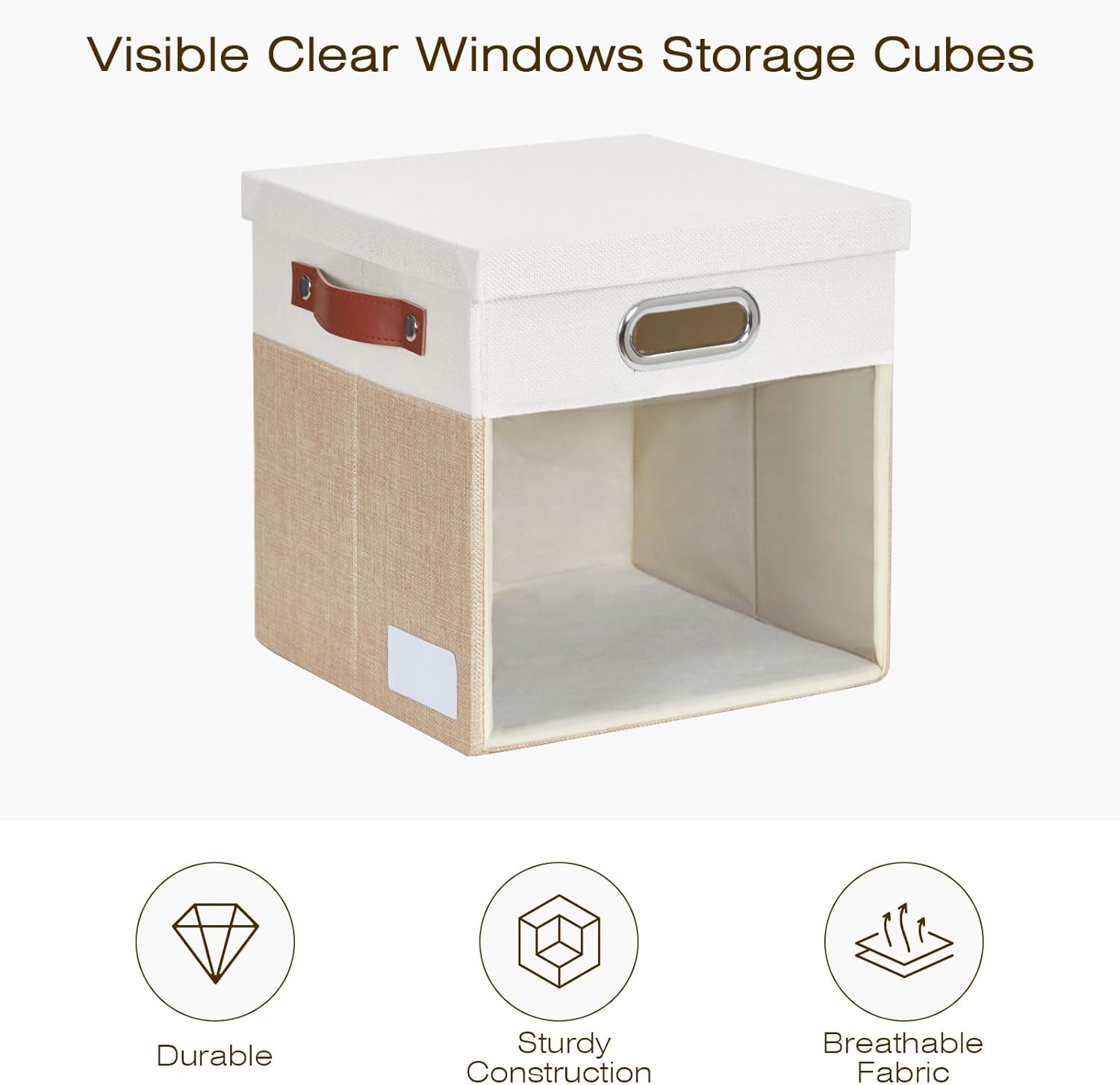 Fabric Storage Cubes with Clear Windows and Lids, 13'' Foldable Storage Bins with 3 Handles, Decorative Storage Boxes for Home, Bedroom, Closet, Office (Beige & White)