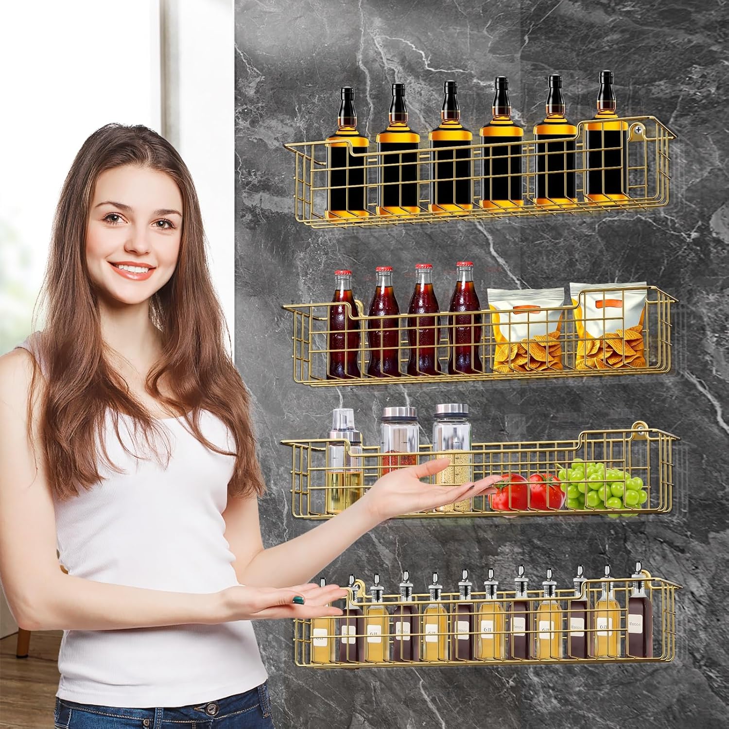 Spice Rack, 4-Pack Seasoning Organizer Wall Mount for Kitchen Storage Organization, Spice Holder Shelf Saving Space for Cabinet, RV, Pantry, Gold