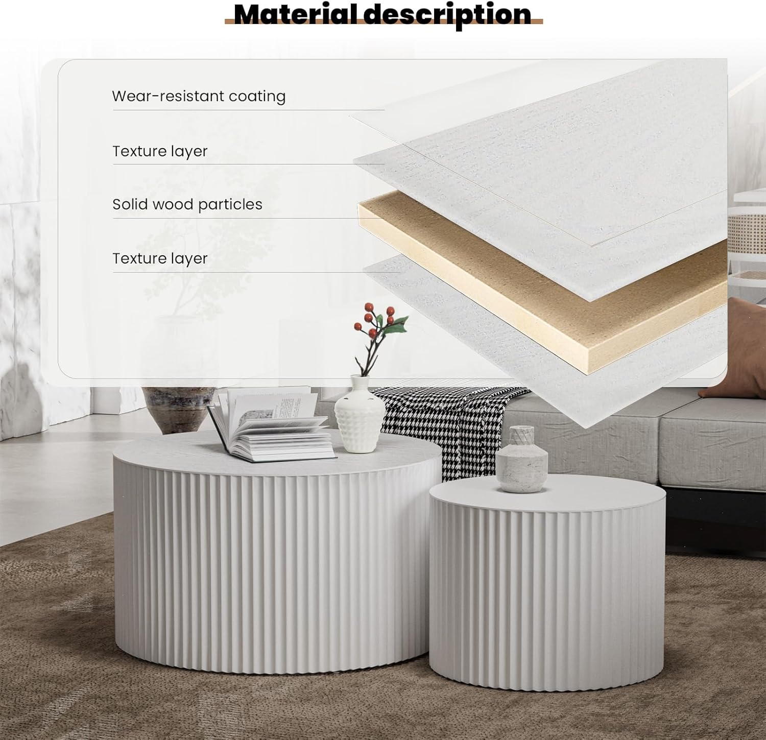 Round Nesting Coffee Table, Drum Wood Coffee Table Set of 2 White, Modern Fluted Nesting Tables Circle Center Table 2 Piece for Small Spaces Living Room Bedroom Balcony Office, No Assembling
