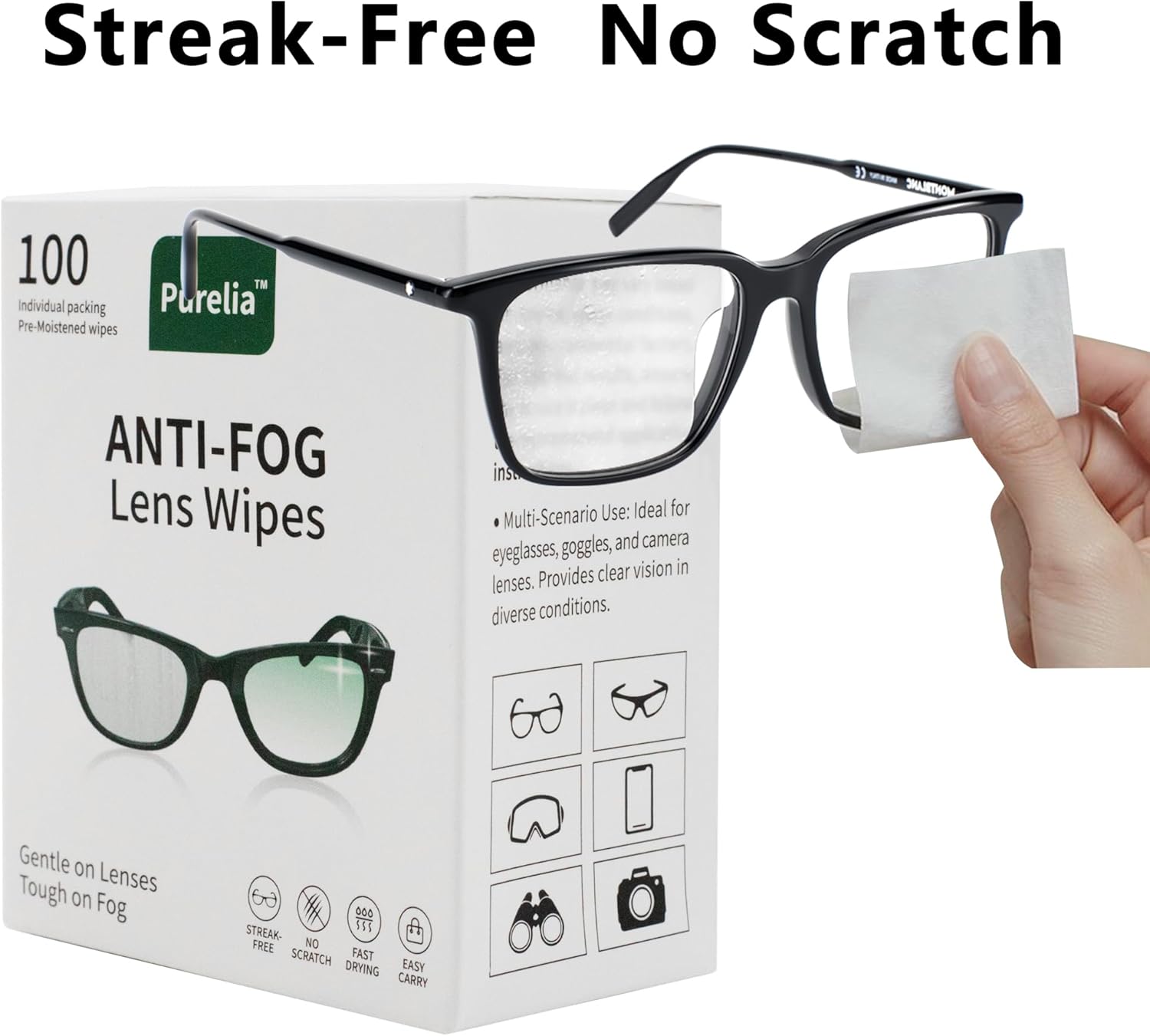 Anti-Fog Lens Wipes,100 Count, Quick-Clean Lens Cloths for Eyeglasses, Goggles, Screens, Portable Individually Wrapped Sheets, Pre-Moistened Cleaning Wipes for Eyeglasses