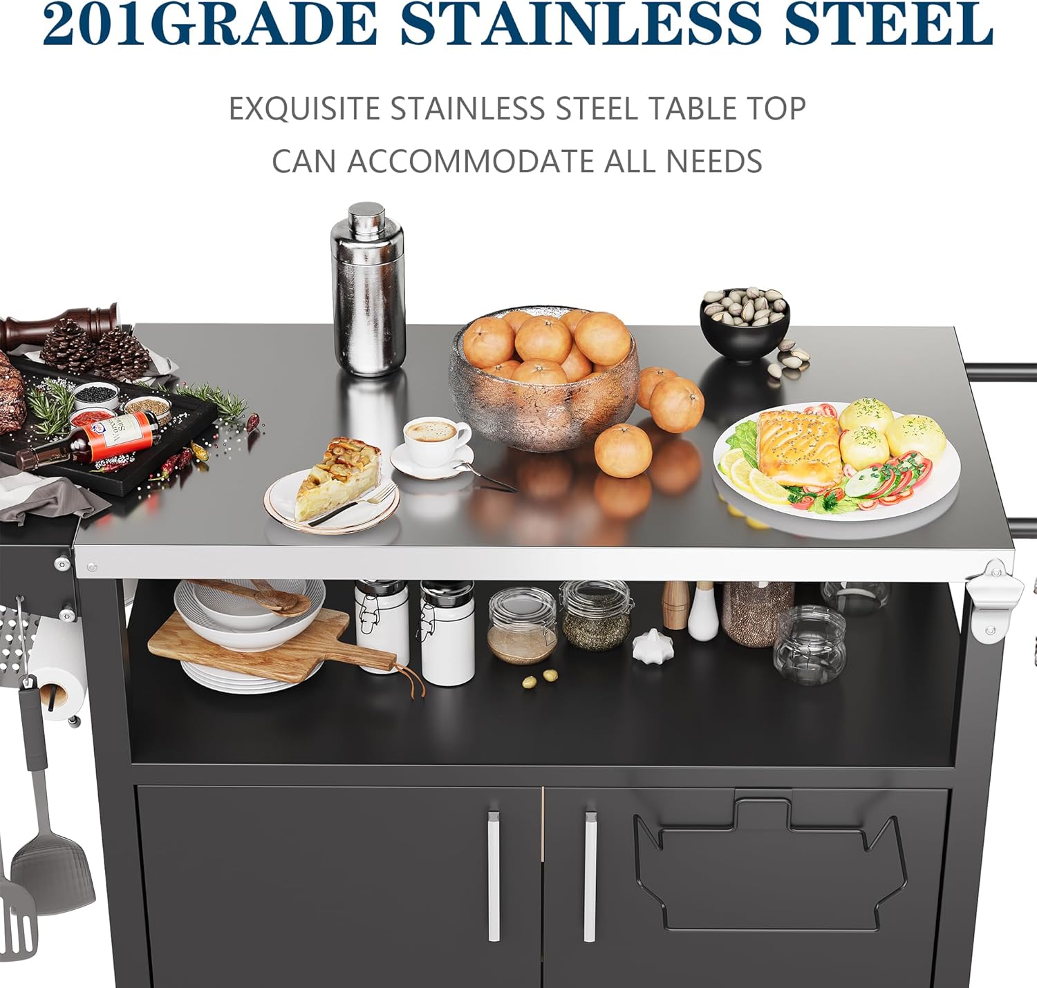 JY QAQA Outdoor Grill Cart with Storage,Patio Kitchen Island Outdoor Grill Table with Wheels,BBQ Cart Movable Pizza Oven Table Stand, Storage Cabinet, Foldable Tabletop, Black
