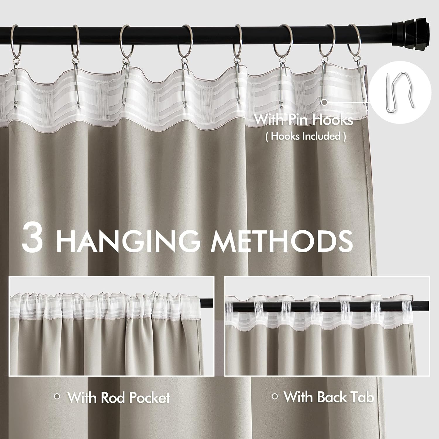 • MULTIPLE HANGING OPTIONS: Each curtain panel features a 3-in-1 top style design: Rod Pocket, Back Tab and Pinch Pleat. The Back loop (2.3 "long) and rod pocket (3.1" long) fit most standard rods. Curtains also can be hung with clip rings or different type of hooks. We will give away 20 pin hooks for each pair of curtains for your convenience (rings won't be included). 3 ways to meet your various needs.