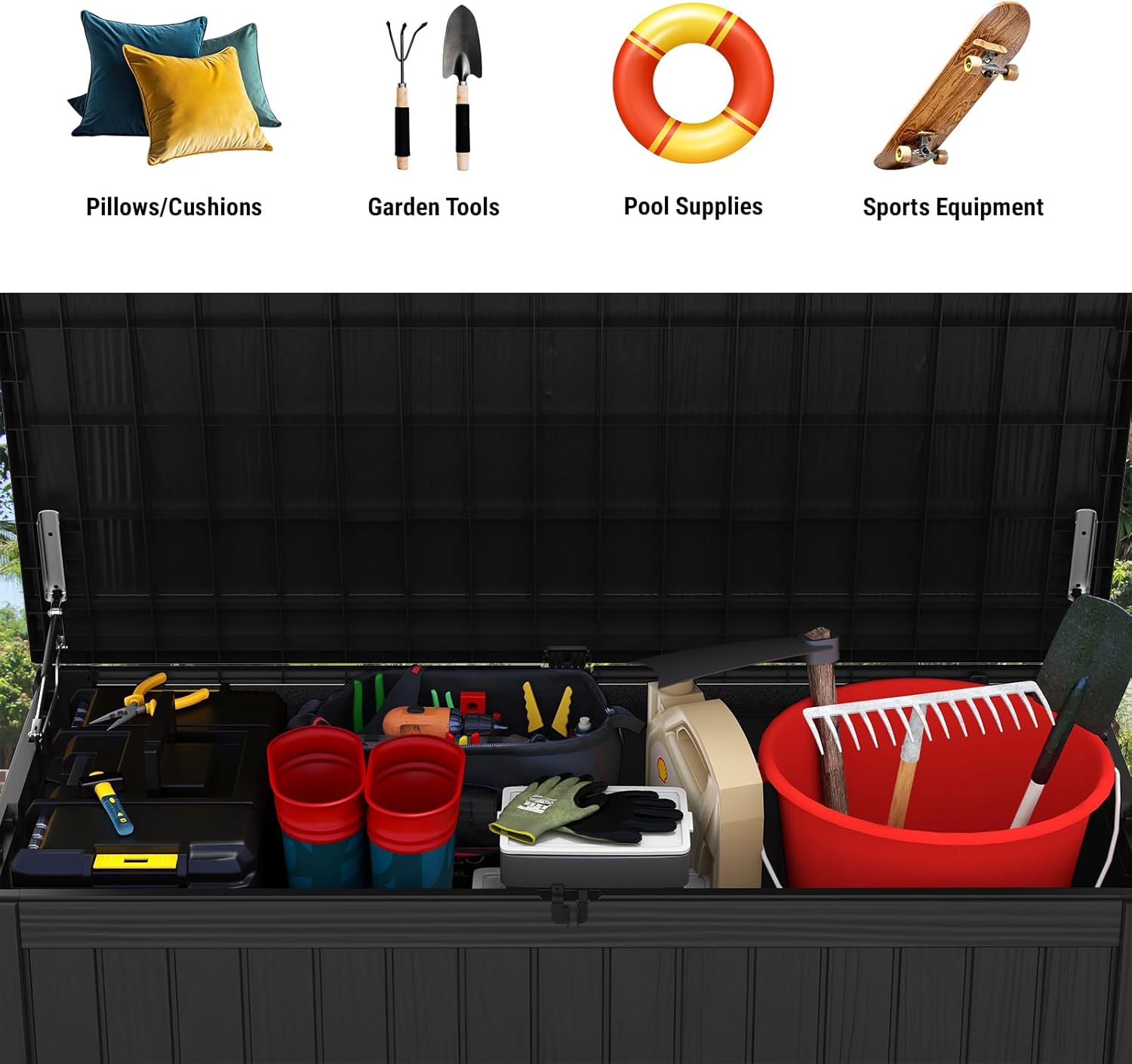 • 【Smooth & Secure Operation】- Designed with dual side hydraulic hinges, the lid opens effortlessly and stays in place, allowing easy access to your items, the slow closing mechanism ensures safe operation for family members, while the lockable lid (lock not included) adds an extra layer of security for your outdoor essentials