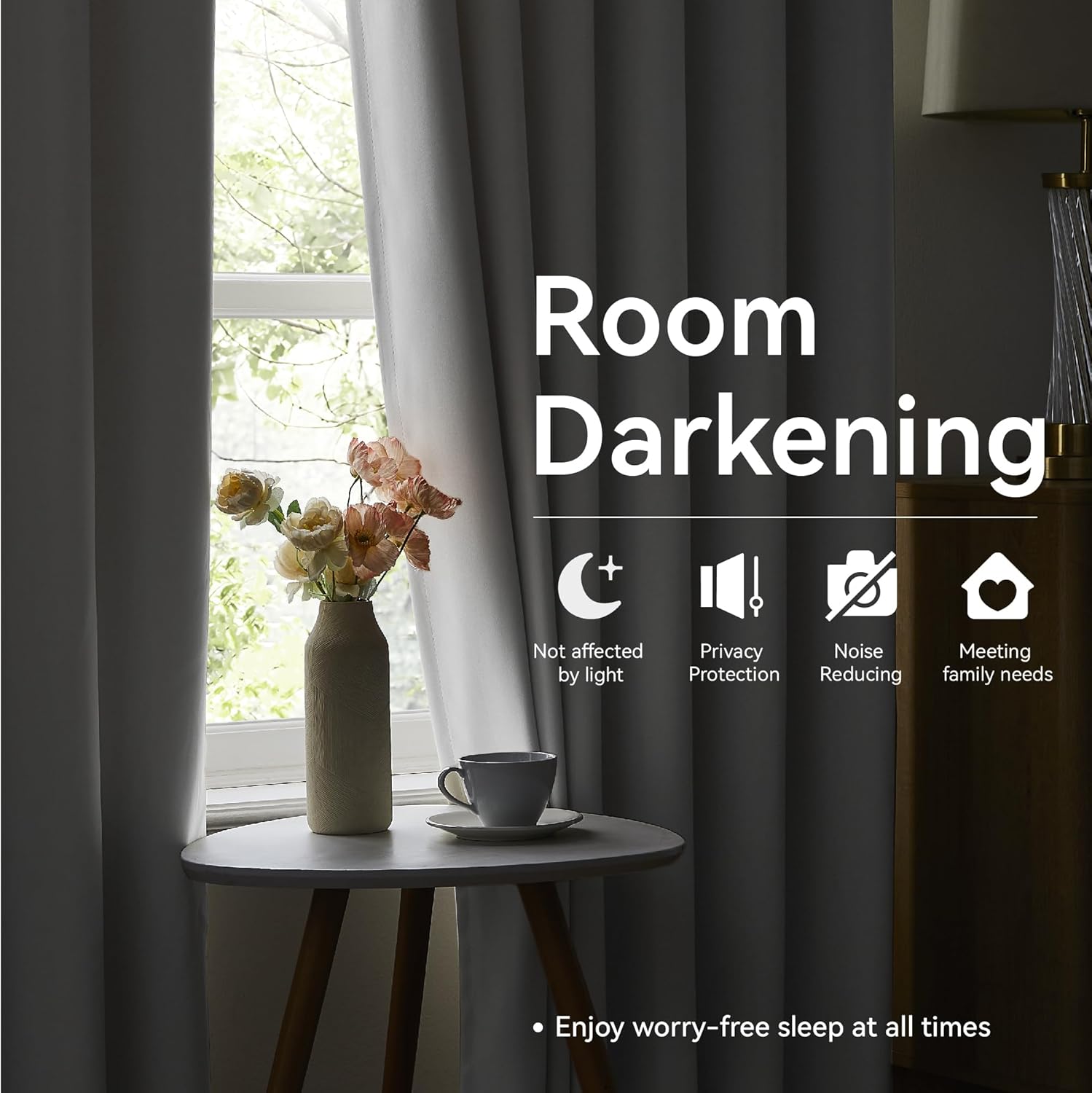 • Room Darkening & Thermal Insulated:Crafted to block out up to 85%–95% of sunlight, these blackout curtains help darken the room, reduce glare, and provide enhanced privacy—ideal for napping, movie nights, or light-sensitive settings. The thermal insulation offers excellent energy saving performance by keeping rooms warmer in winter and cooler in summer. These curtains also provide sound dampening benefits, helping to reduce outside noise for a more peaceful environment.