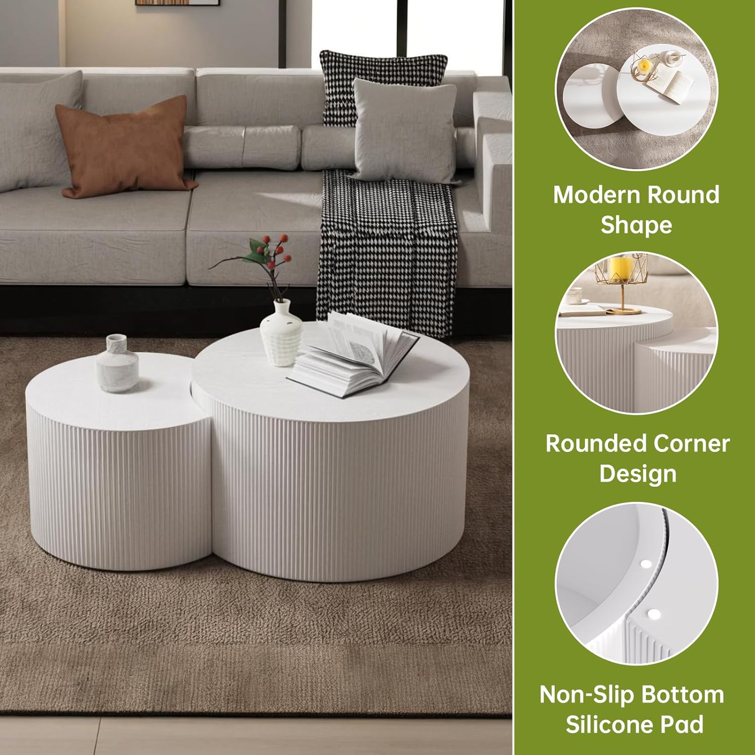 Round Nesting Coffee Table Modern White Fluted Coffee Table Set of 2 for Living Room Circle Drum Coffee Tables Round Nesting Tables Crescent Side Accent End Table for Small Space (White A 27in)