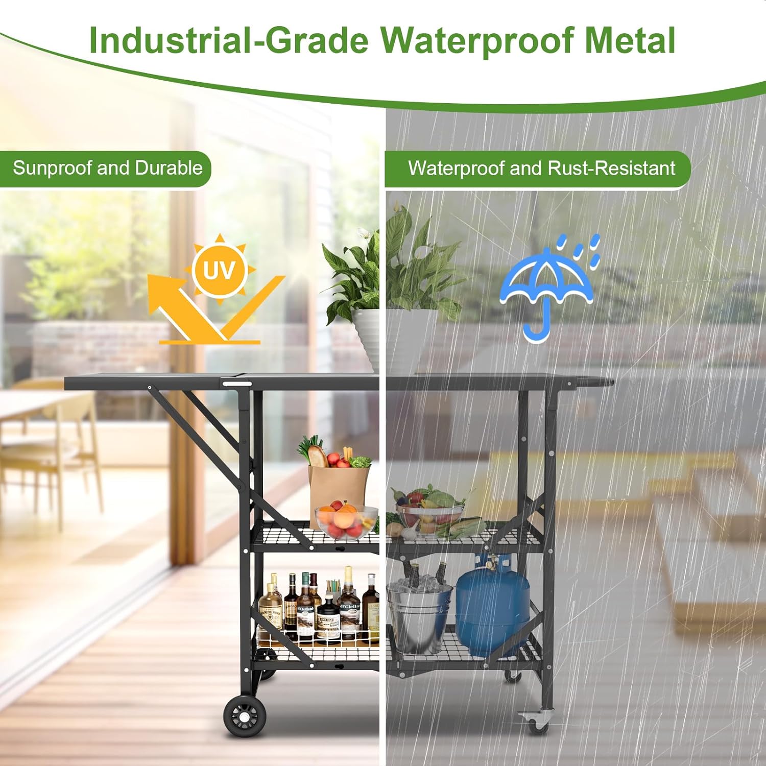 • 2-Step Installation: Simply attach the wheels and unfold it. You'll be able to use the grill cart in under 1 minute. And when you're done, it folds up in less than 5 seconds to fit into a compact space.