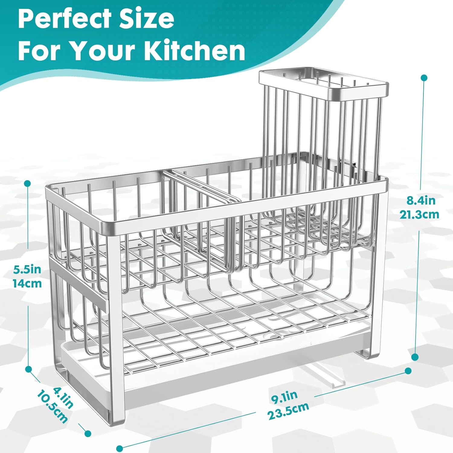 • 【DOUBLE LAYER CAPACITY】Measures 9.1" x 4.1" x 8.4". Our sink sponge holder is larger than the sponge rack on the market. Can holds 2 detergent bottles, a sponge ball, a stainless steel scrubber and sink stopper at the same time. With an extra upgraded brush holder that can hold up to 4 small and large sized brushes, with the Sinnsally sink caddy you can save countertop space perfectly. Please measure the size of your sink before buying this product.