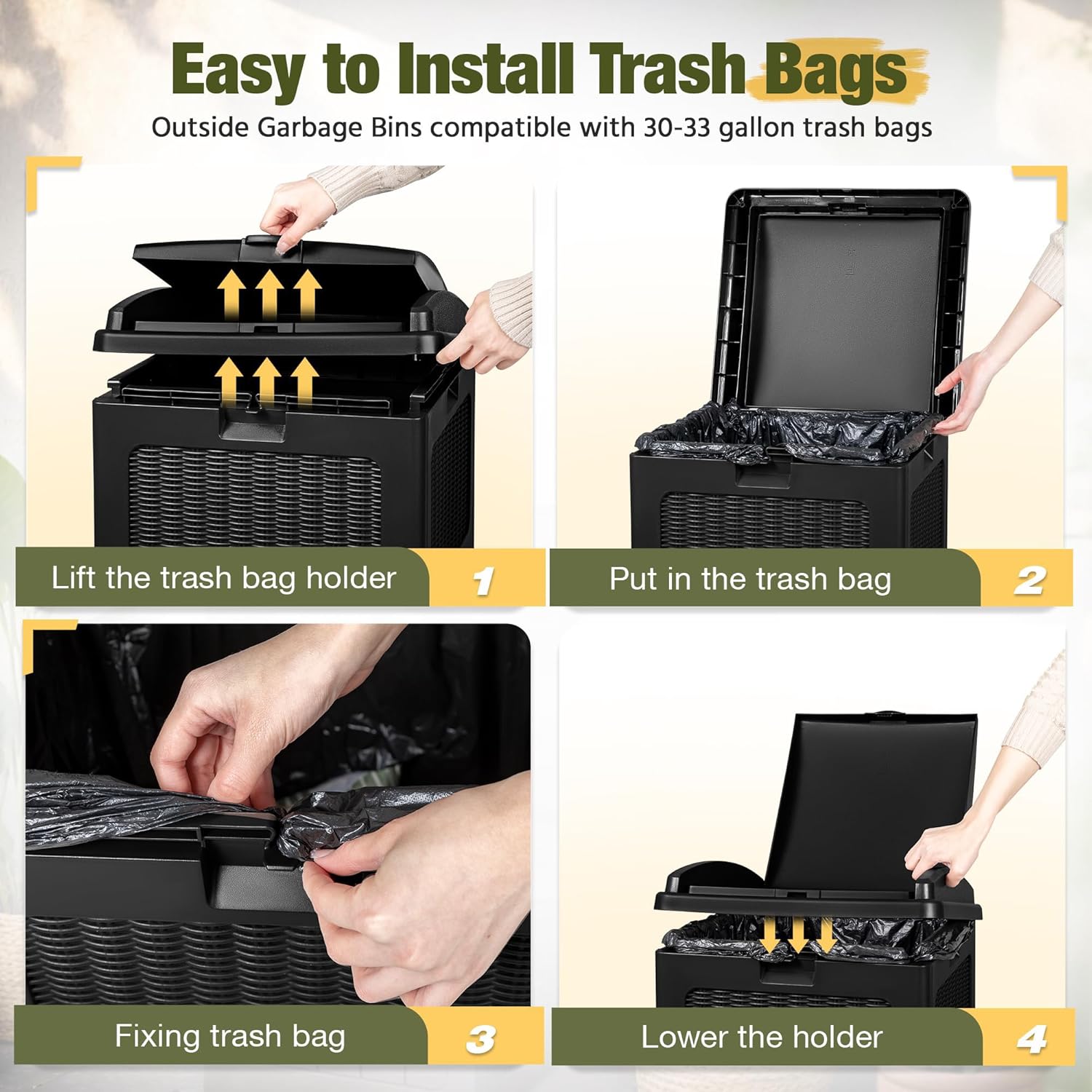 • Smart Dual Lid Design: This trash can designed with Innovative dual lid hides trash bags for a tidy yard, the outer lid opens and closes easily with one hand and keeps out odors, the inner lid stabilizes trash bags in place