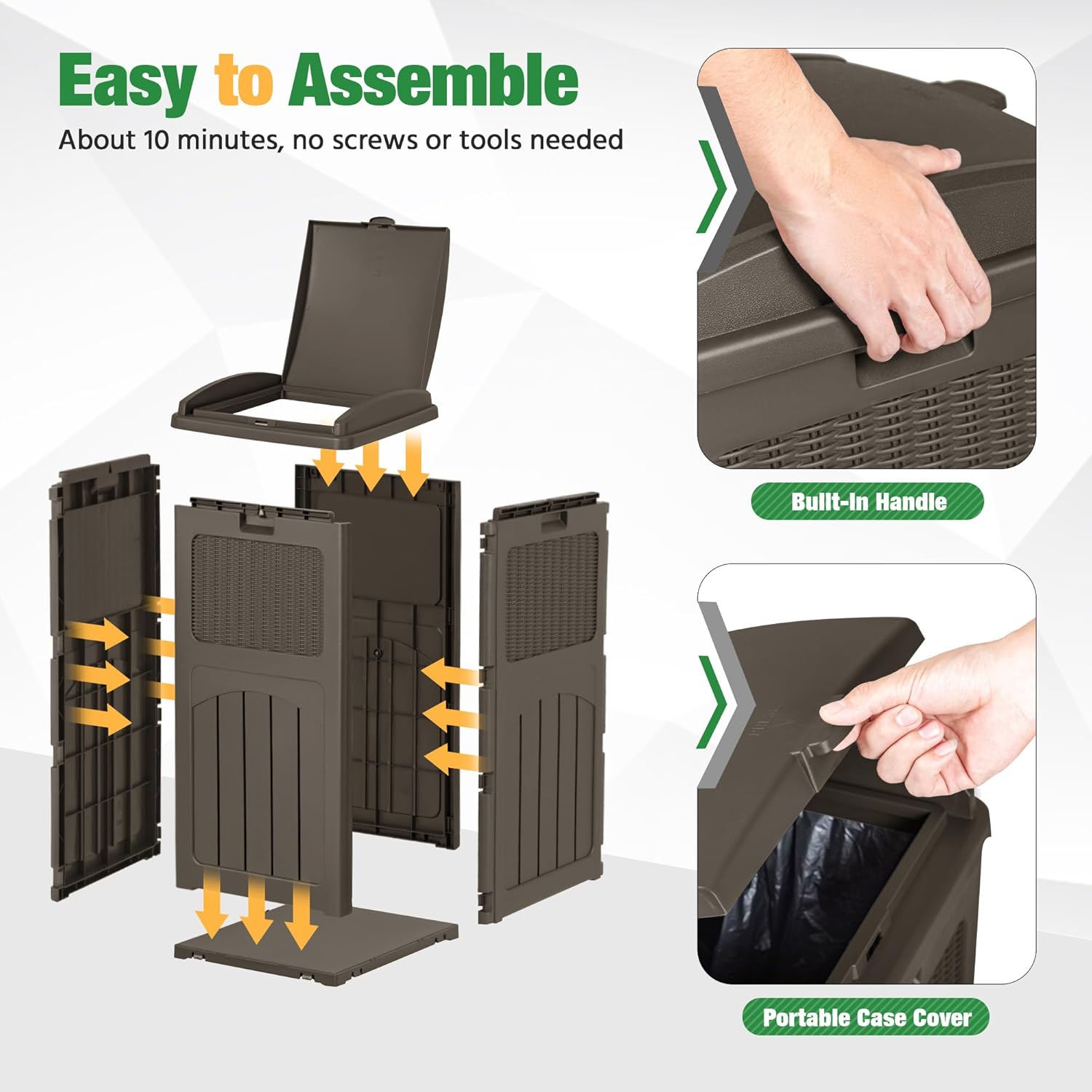 • Easy to Install Trash Bags: The waste bin for outdoors is compatible with 30-33 gallon trash bags. You need to lift the trash bag holder, put on the trash bag, put down the holder, and then finish the installation. After opening the inner lid, the garbage bag can be stably fixed in the card slot
