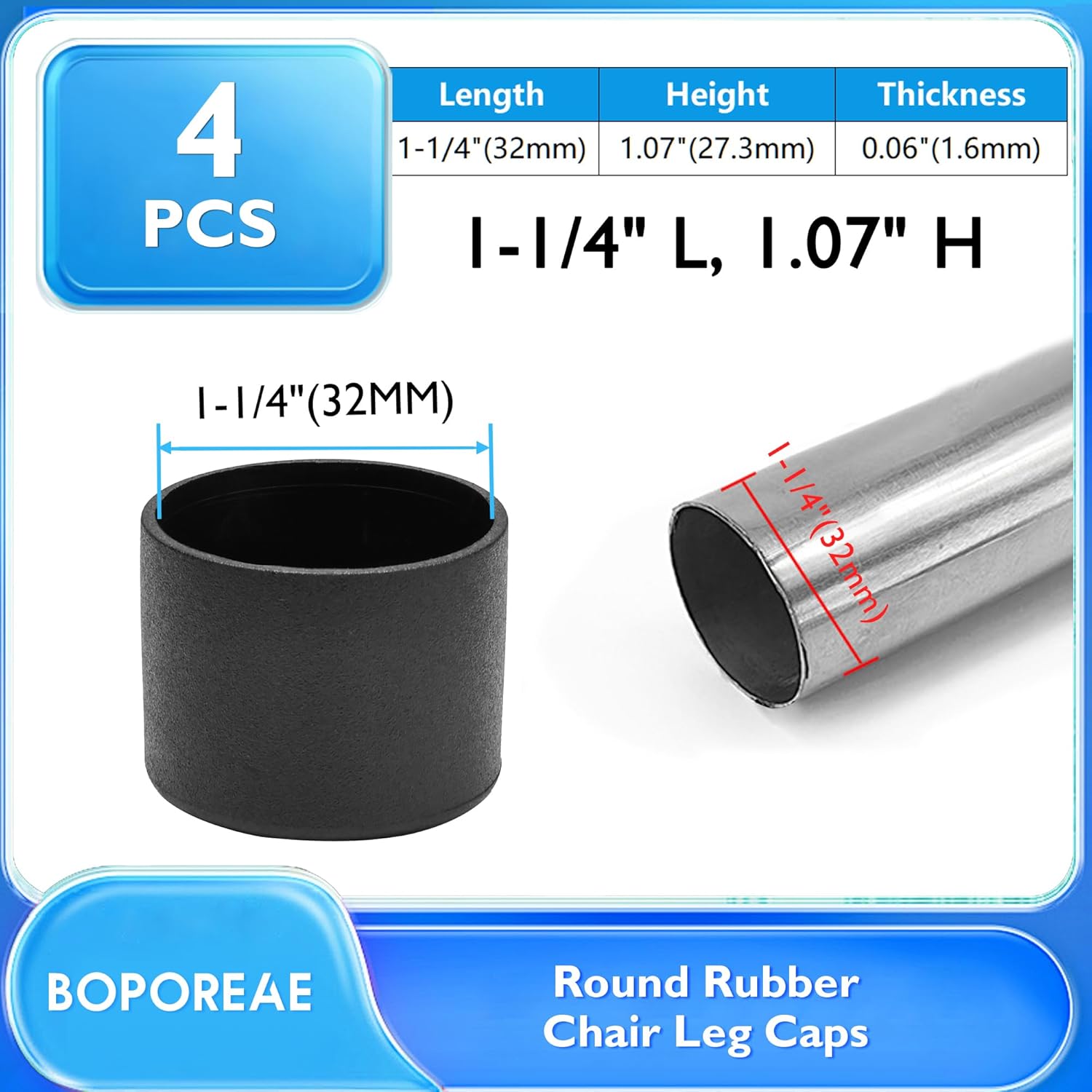 • Dimension and Quantity: 4 black round chair leg floor protectors, suitable for 1.25"(32 mm) OD round chair legs; We offer different size options,including 1"- 3" round chair feet, allowing you to find the perfect fit for your specific needs (Please confirm that you are measuring the outside, not the hole)