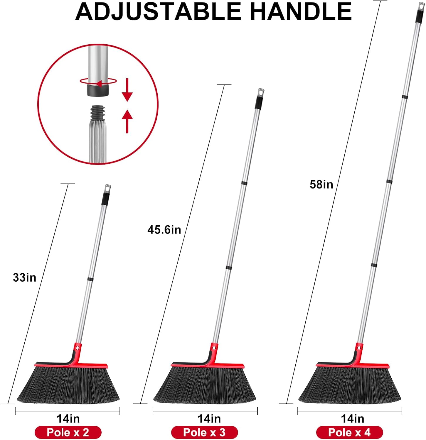 • ⭐【14″ Wide Broom Head with 58″ Adjustable Handle】14-inch wide broom head with a full-size 58-inch handle for indoor & outdoor sweeping. Adjustable height ensures a comfortable fit for users of all heights.
