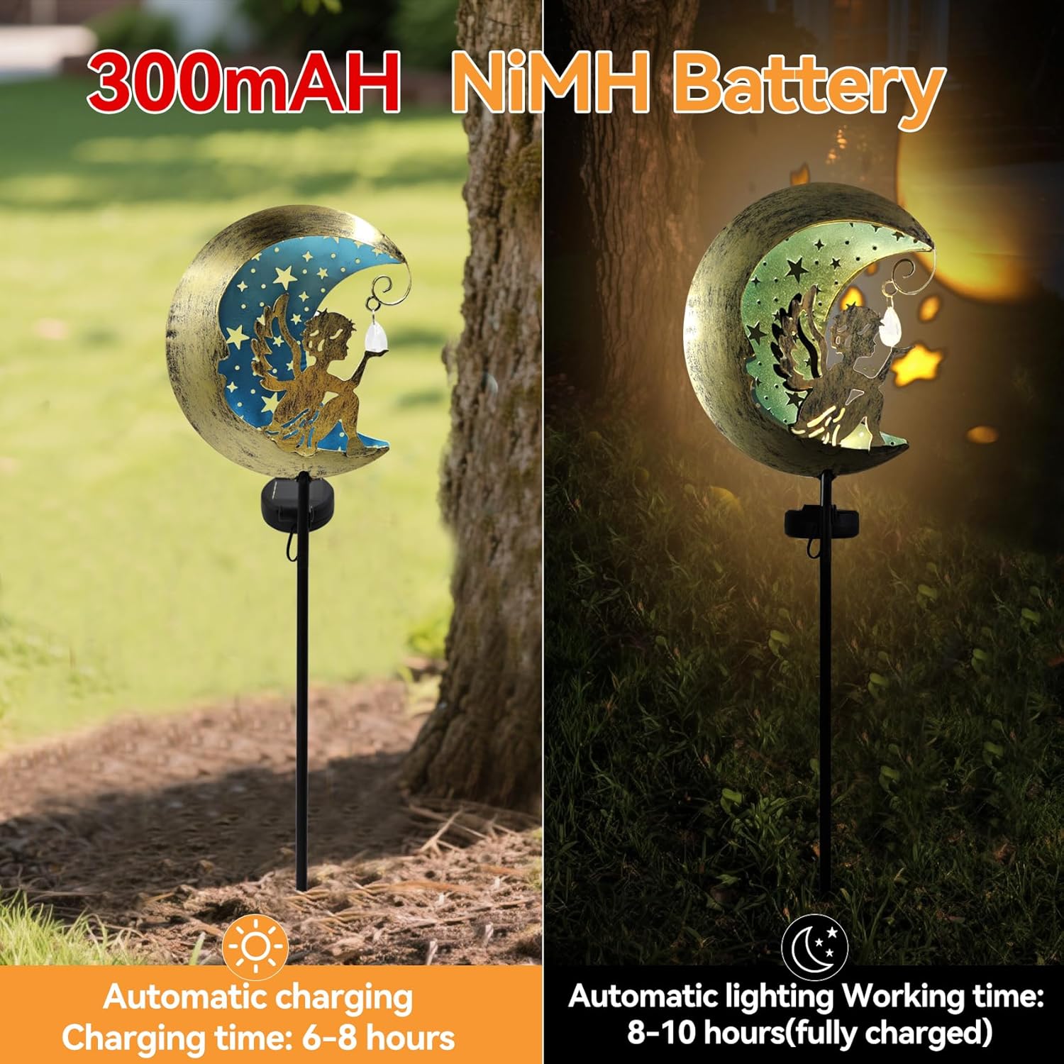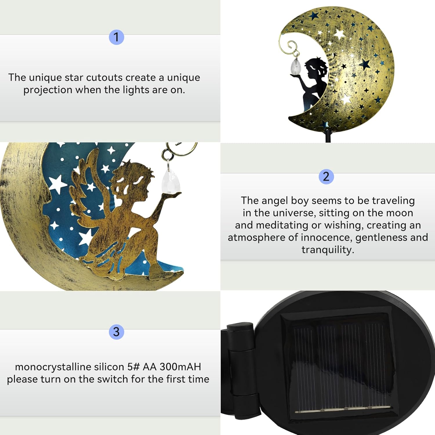 • Solar-Powered Light: Equipped with a built-in solar panel, this angel moon stake charges during the day and automatically lights up at dusk. No wires, no batteries, no fuss—just place it in a sunny spot and enjoy the warm, ambient LED glow each evening