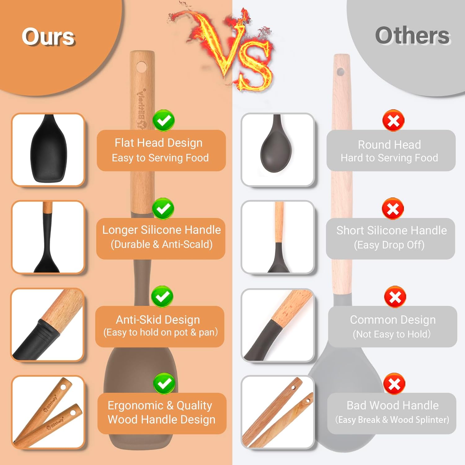 • 🥄【Comfortable & Ergonomic Wooden Handle】This Silicone Cooking Spoons are designed with natural wood handle. The smooth round handle can reduce hand fatigue during prolonged cooking sessions.The natural wood provides a secure grip, resists heat transfer, and complements modern kitchen aesthetics, and fits comfortably in your palm, offering precision for delicate tasks like flipping eggs or portioning pasta.