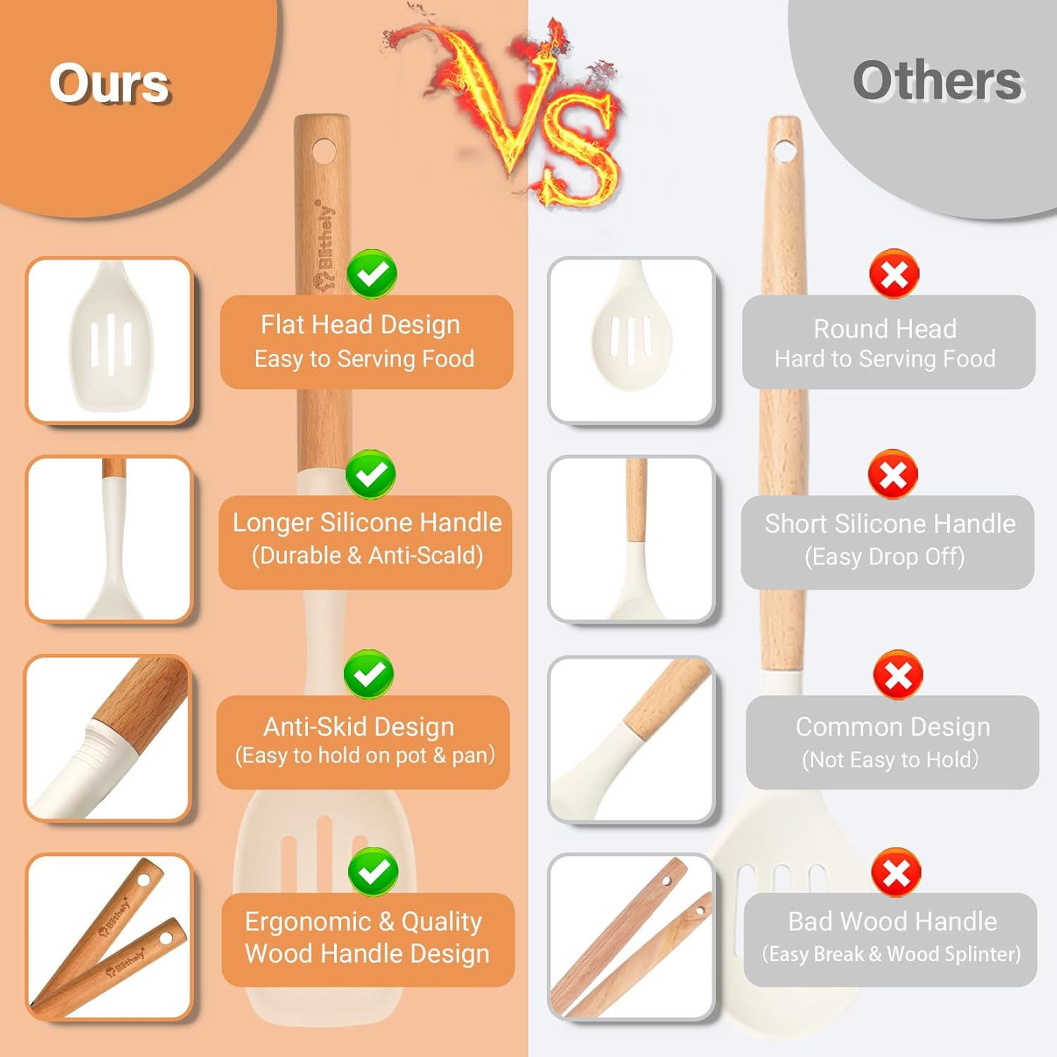 • 🥄【Comfortable & Ergonomic Wooden Handle】This Silicone Cooking Spoons are designed with natural wood handle. The smooth round handle can reduce hand fatigue during prolonged cooking sessions.The natural wood provides a secure grip, resists heat transfer, and complements modern kitchen aesthetics, and fits comfortably in your palm, offering precision for delicate tasks like flipping eggs or portioning pasta.