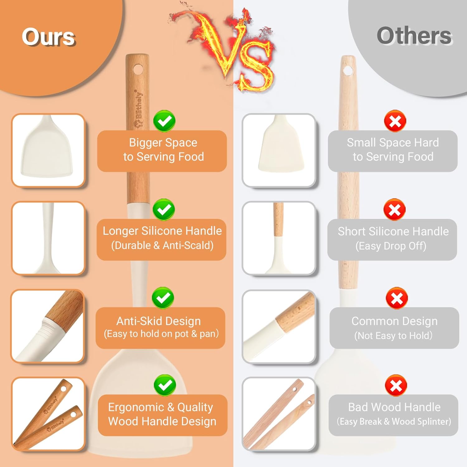 • 🏆【Easy to Clean & Attention】Our silicone utensil set have smooth surface which is easy to clean. Attention: This product comes with a natural wood handle. Please do not soak it in water for a long time or use a dishwasher. Avoid using a hard or abrasive dishwashing brush to clean the wooden handle. It is recommended to clean it by hand with clean water or gently wipe it with a soft cloth. Make sure the wooden handle is completely dry before storage.