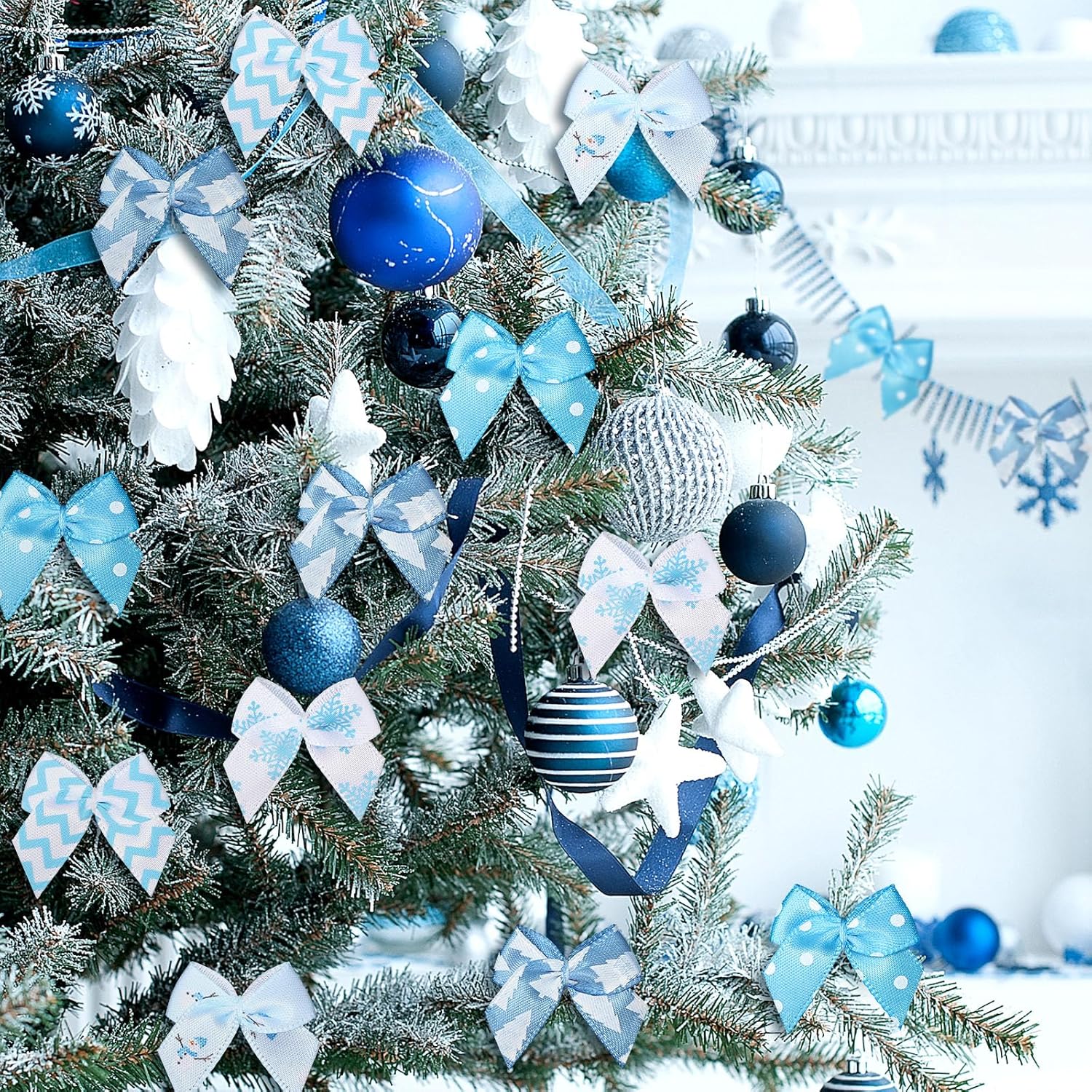 Syhood 150 Pcs Christmas Mini Bow Tiny Twist Tie Bow Handmade Craft Ribbon for DIY Sewing Party Decor(Blue and White,Snowy)