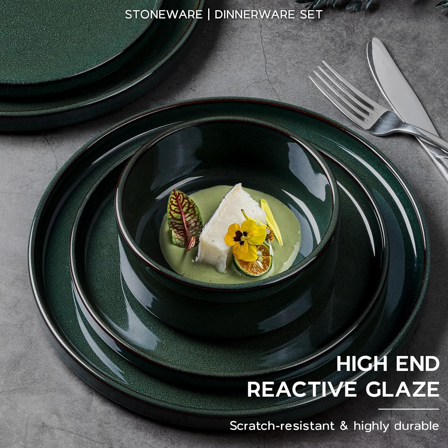 Onader Stoneware Dinnerware Sets for 4, Reactive Glaze Plates and Bowls Sets, Ceramic Dish Dinner Set with Rustic Terracotta Bottom, 12 Piece Elegant Dishware - Emerald Green