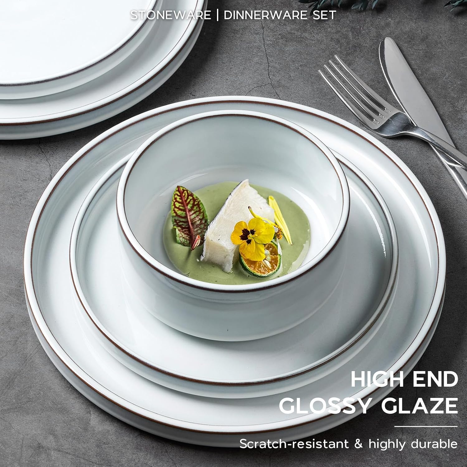 Onader Stoneware Dinnerware Sets, 12 Piece Plates and Bowls Dish Sets for 4, Ceramic Dishware Dining Ware with Rustic Terracotta Bottom - Glacier White