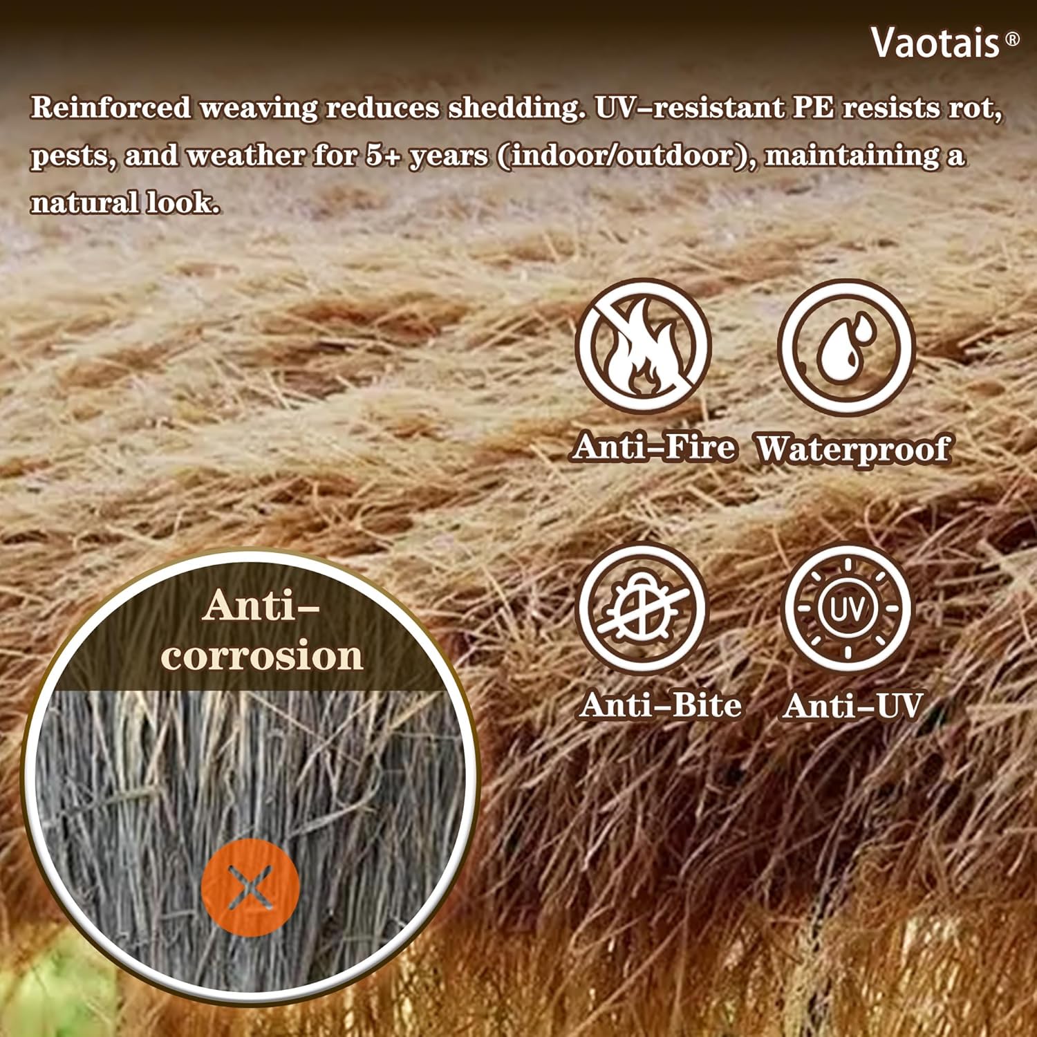 • Enhanced Durability: Our thatch features reinforced weaving to significantly reduce shedding and debris, a frequent issue with other products. Crafted from UV-resistant PE material, it’s built to withstand rot, pests, and harsh weather—providing lasting performance for 5+ years indoors or outdoors. The durable construction ensures resilience against daily wear while maintaining a realistic, natural appearance.