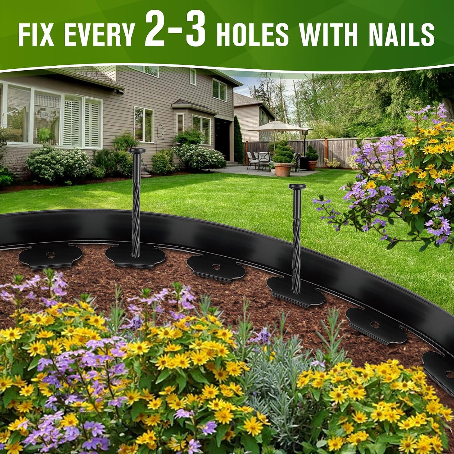 • No Dig Edging: This no dig edging for landscaping, no need to dig or bury, just hammer anchoring spikes into ground every 2-3 holes to secure edging to the ground and keep the contours of your design. This garden edging border no dig is suitable for all soil types, ideal for landscaping edging, garden edging, lawn edging and yard edging