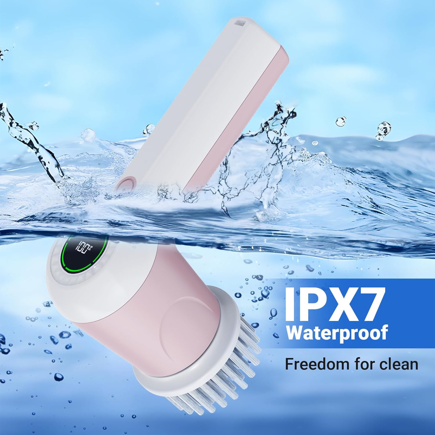Electric Spin Scrubber, Cordless Shower Scrubber with Battery Level Display, 2 Speeds Electric Scrubber for Cleaning with 6 Replaceable Heads, Cleaning Brush for Bathroom/Sink/Window (Pink)