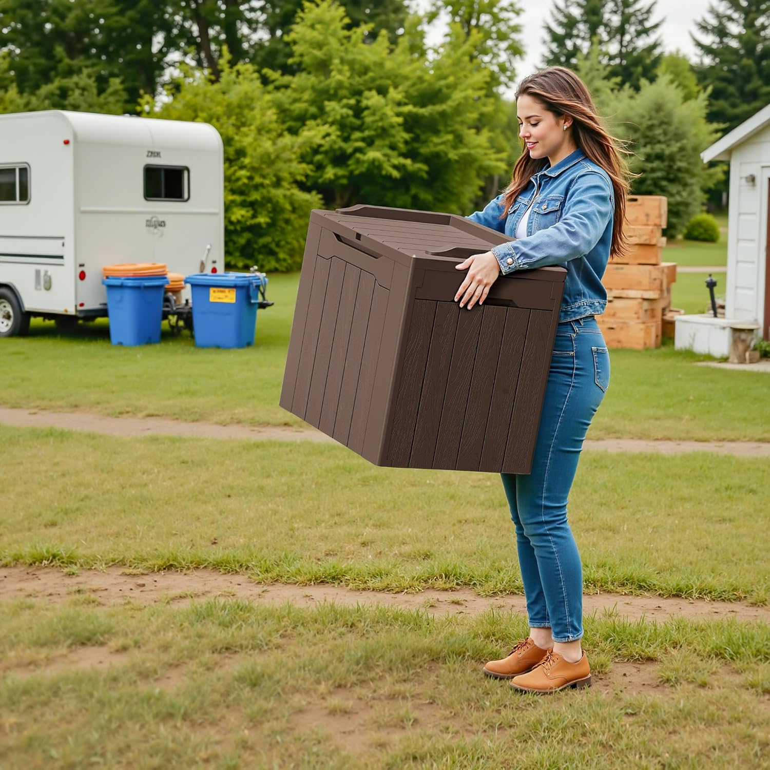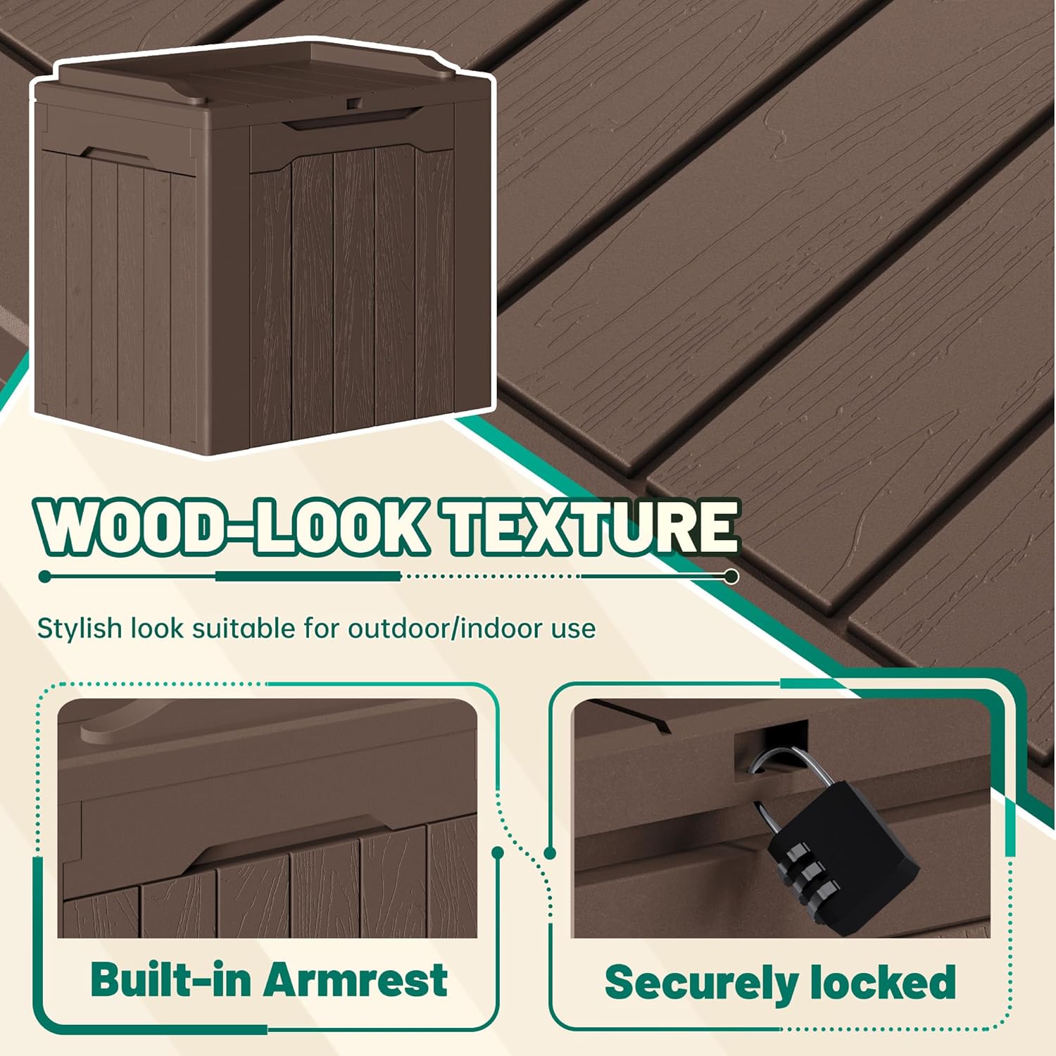 • Light & Solid: Made of a high density resin material, it is stable, waterproof and UV resistant. The net weight of this deck box is only 8.8 pounds