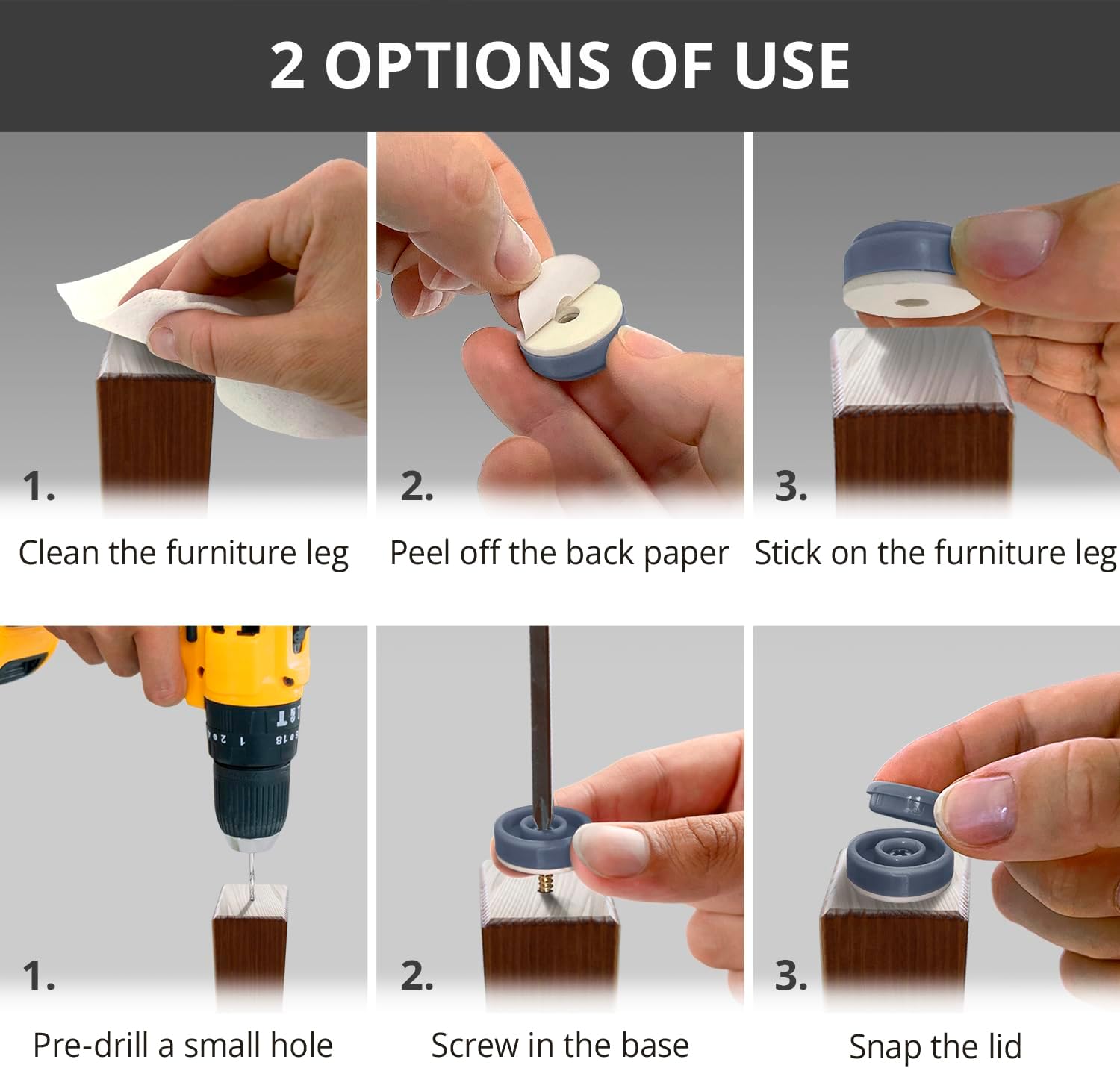• ✌️ 2 OPTIONS OF USE - X-Protector Chair Sliders can be used by screwing in the furniture leg or just sticking on the furniture feet - YOU CHOOSE HOW TO USE OUR CHAIR LEG FLOOR PROTECTORS!