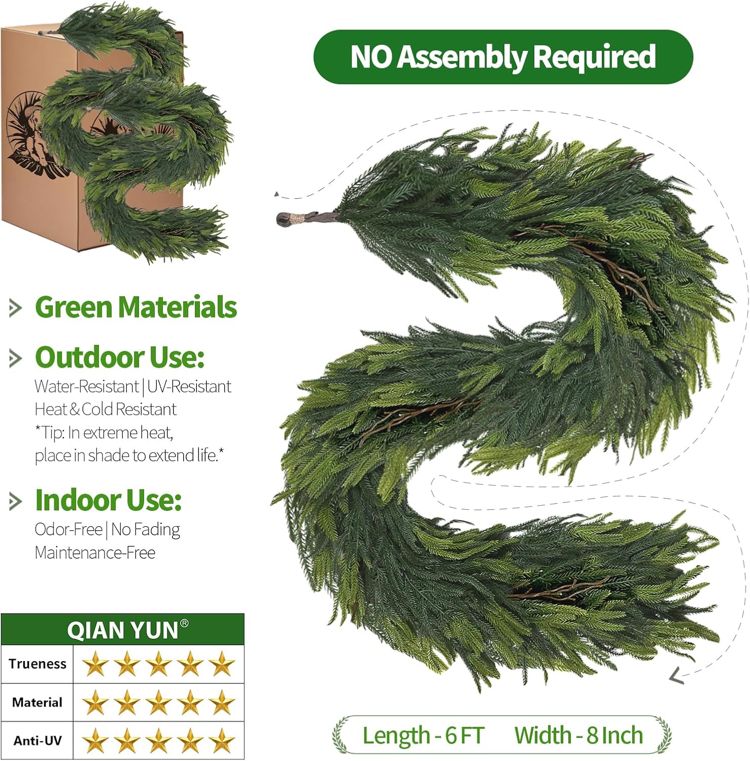 • 【Package & Size】Includes 2 piece of 6FT artificial Norfolk pine greenery garland, featuring extra-dense and full pine needles for a lush, high-end look. Compact yet eye-catching, perfect for enhancing any indoor or outdoor setting.