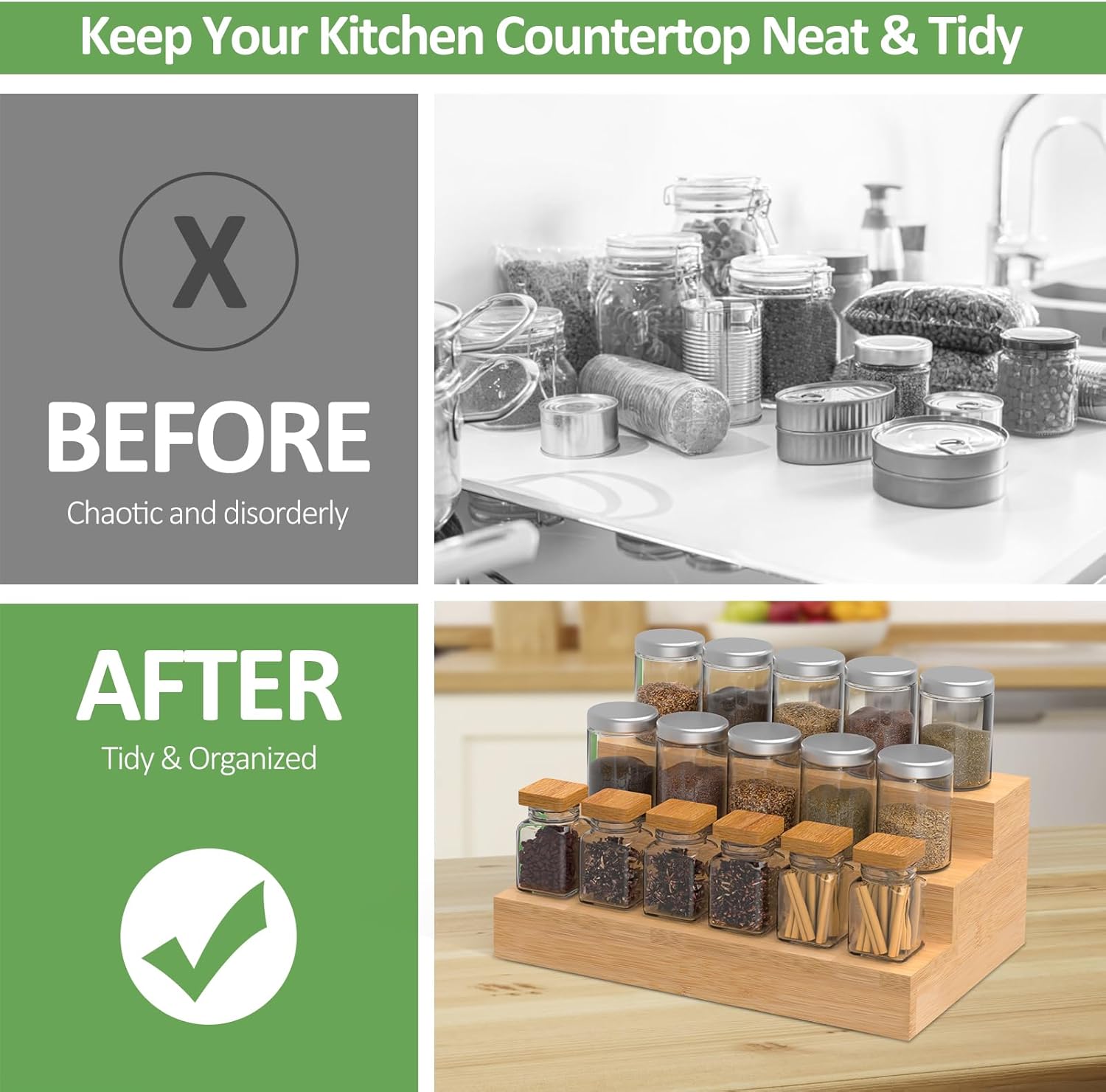 • DISORDER DESTROYER - With our tiered spice racks, it's difficult to forget about spices in the back of your cabinet. You won't play a guessing game as you lift them one at a time to check. This is a simple solution to make all of your spice jars visible. It keeps them within reach when you are cooking.