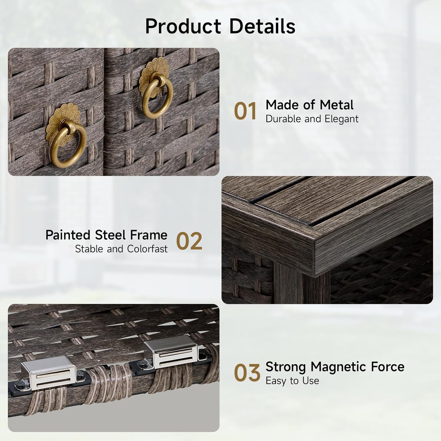 • Weatherproof Materials: Rain or shine, this patio cabinet stays elegant! Handwoven PE rattan brings nice texture that resists cracking, paired with a painted steel frame that resist rust and sunburn. Whether on a sunny patio or in a humid environment, rotting and fading are no more. Tough enough for outdoors, chic enough for indoors!