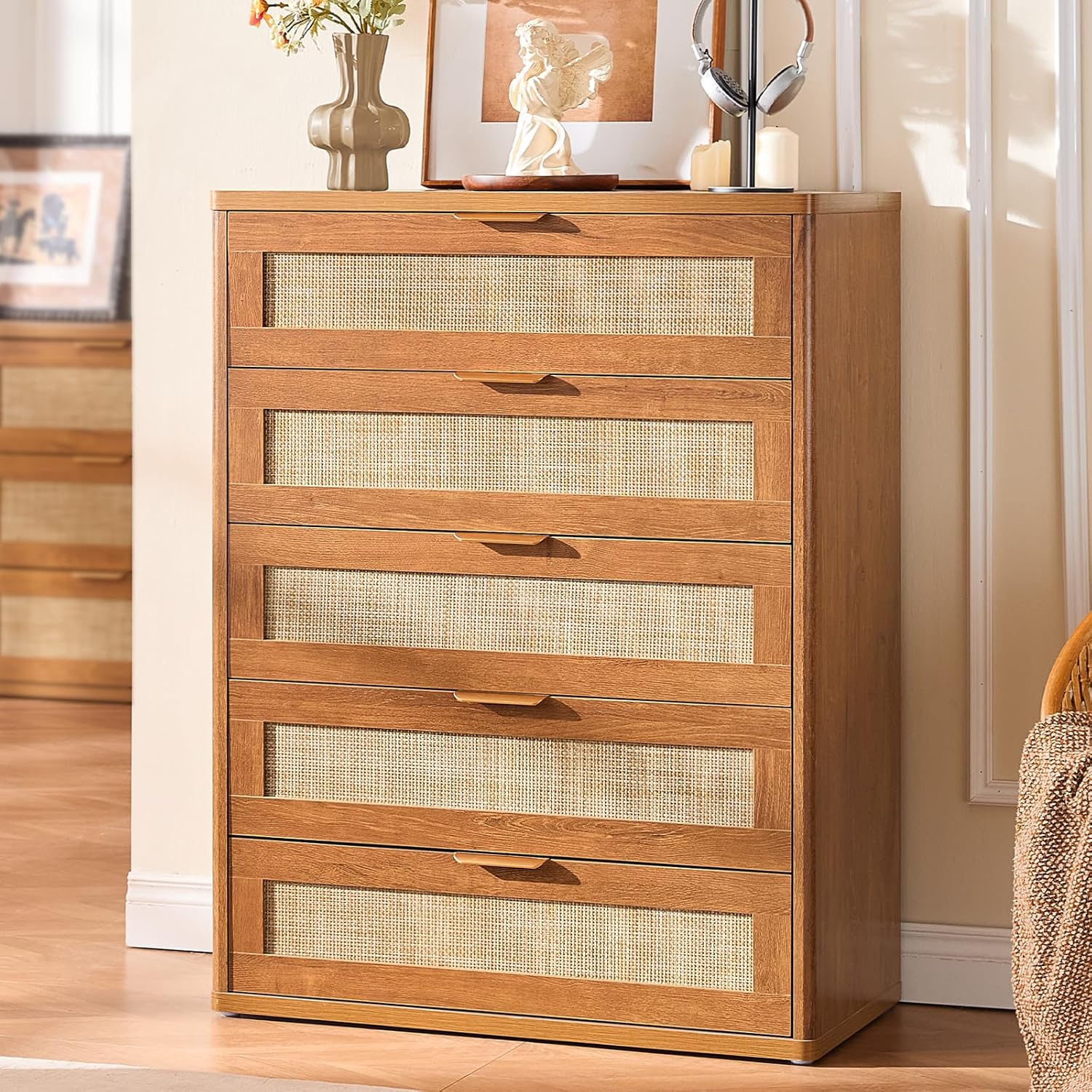 • Boho 5 Drawers Rattan Dresser for Bedroom : This 5 Drawer Wood Dresser flawless combines Boho and modern styles. The rattan-decorated drawers and natural wood grain enhance its visual appeal. This exquisite dresser for closet is available in multiple color options, easily blending into various decor styles to create a cozy home atmosphere.