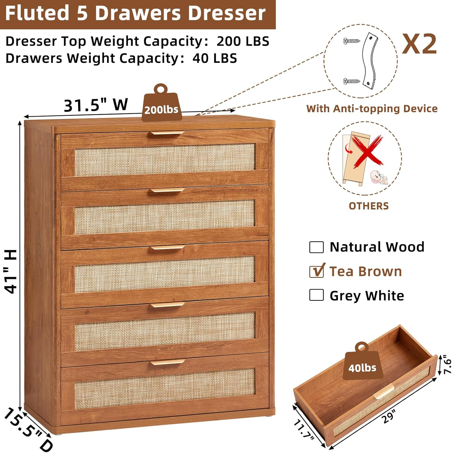 • Enhanced Design Details for Quality Living : Our 31.5" L x 15.5" W x 41" H small dresser with drawers is made from high-quality wood, ensuring durability. The wooden bedroom vanity features premium slides, immersing you in luxurious convenience. The nursery dresser thick, curved edge tabletop effectively prevents collisions. The anti-tip device provides comprehensive safety for homes with children or pets.