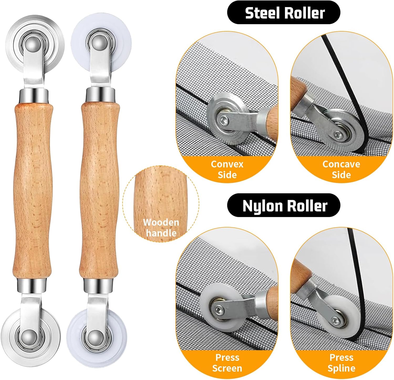 • Complete Accessories: (1) One pair of scissors: You can cut the screen mesh to the size you want according to the size of your window. (2) 50ft screen spline: Hollow design for easy pressing into the groove and fixing the screen. (3) Two rolling screen window tools: solid beech wood handle+double steel bearing metal wheel; Smooth edges that won't scratch the screen. (4) A spline hook: easy to move old splines. (5) 8 screen support clips: fixed windows, reusable (6) a multifunctional knife and a tape measure: help you replace the screen window more conveniently
