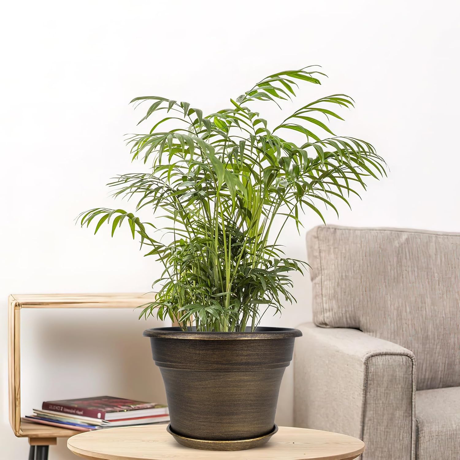 • 【TRADITIONAL DESIGN】Plastic planters for indoor plants with trays are designed in dark gold colors & a classic round look, which allow this pot to fit into any indoor & outdoor setting. With these golded flower pots, it could adds fresh, decorative flair to your home. Decorate your windowsill, desktop, shelf, bedroom, living room, kitchen, garden, office with our 8 inch plastic plant pot.