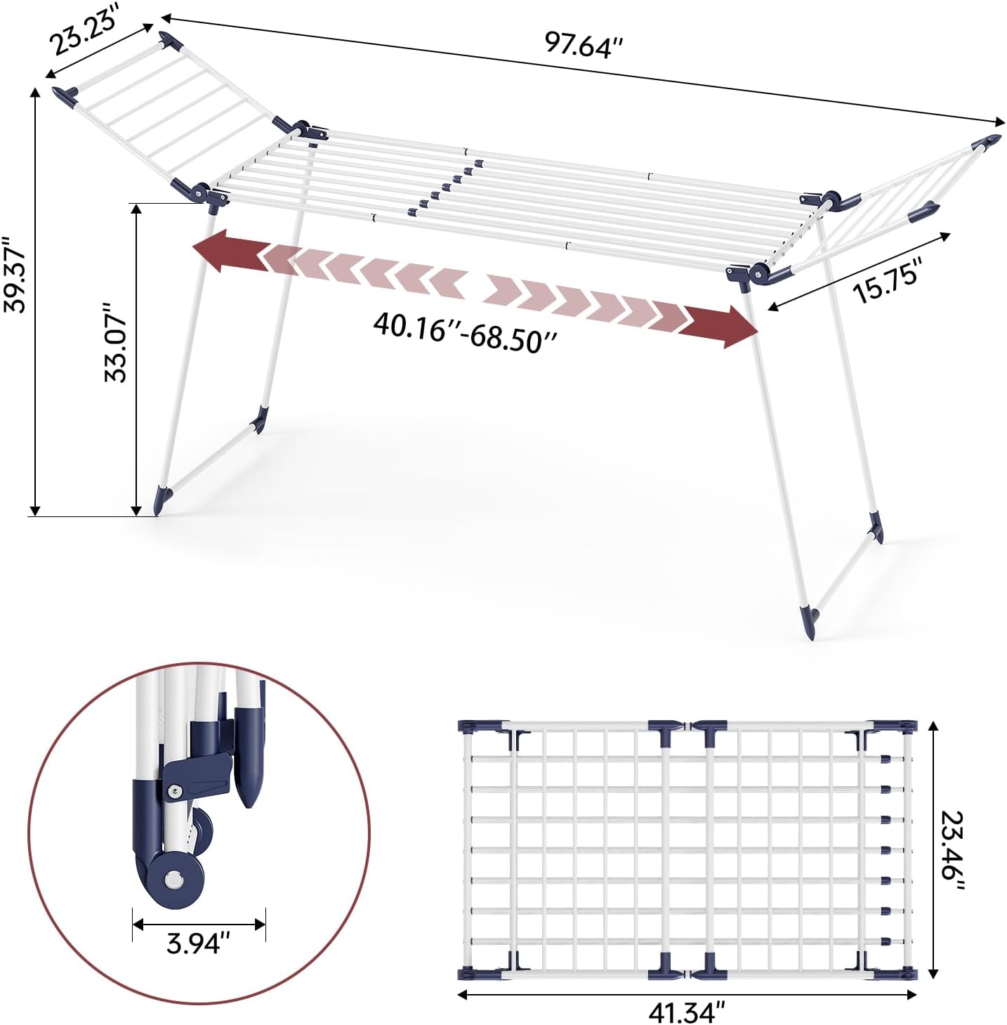 • Large Drying Capacity - The drying space of Apexchaser clothes drying rack is 97.6" X 23.2" X 39.4". The clothes airer has 9 long pipes which can be extended and 12 short pipes which can dry a full load of clothing in one go