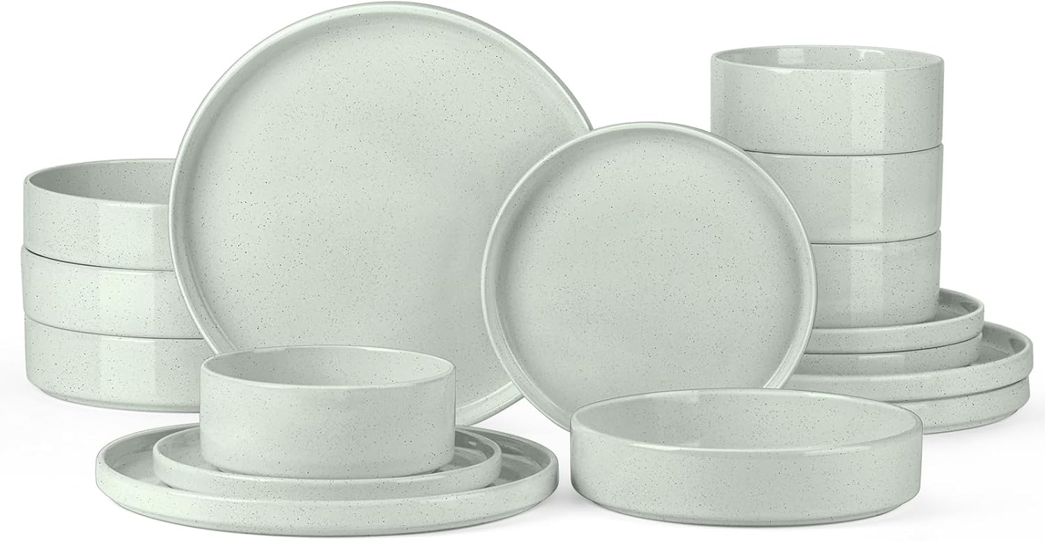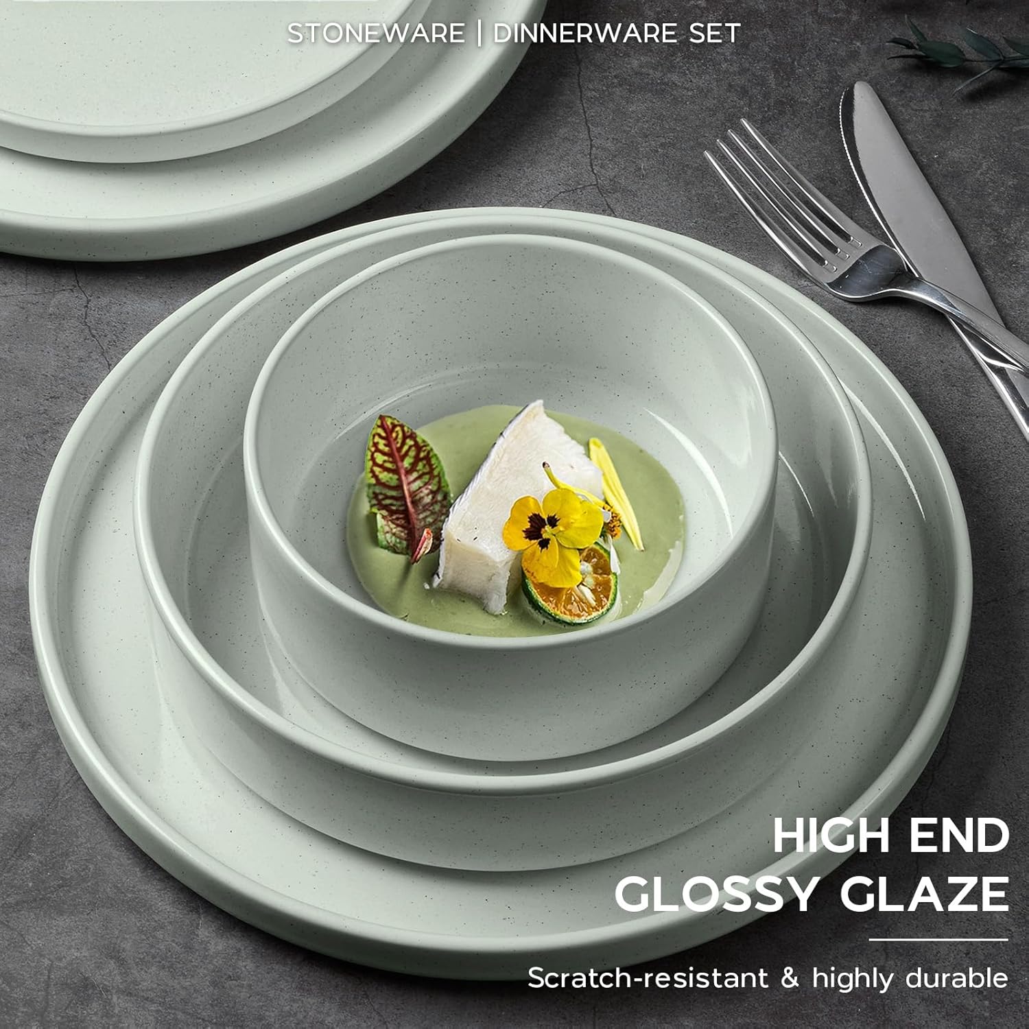 Onader Speckled Dinnerware Set for 4 with Pasta Bowl, 16 Piece Stoneware Plates and Bowls Dishes Set, Microwave & Dishwasher Safe – Pale Sage Green
