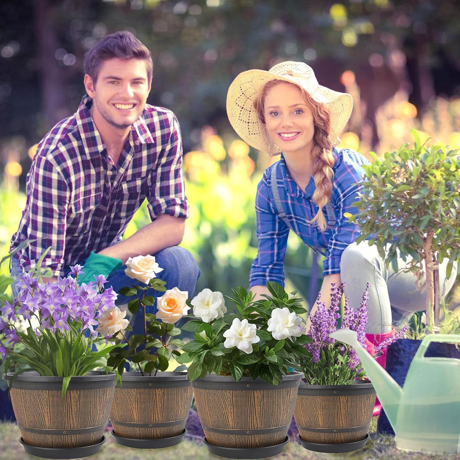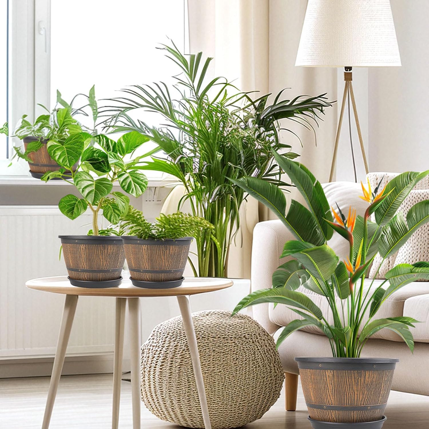 • 【Decorative Planters】Plastic pots for plants are perfect for indoor outdoor---decorating your windowsill, desktop, living room, kitchen, bedroom, bookshelf,balcony, garden, porch, patio and so on. These whiskey barrel indoor planters are a must-have for plant lovers. Give your plants a stylish home while bringing your green dreams to life!