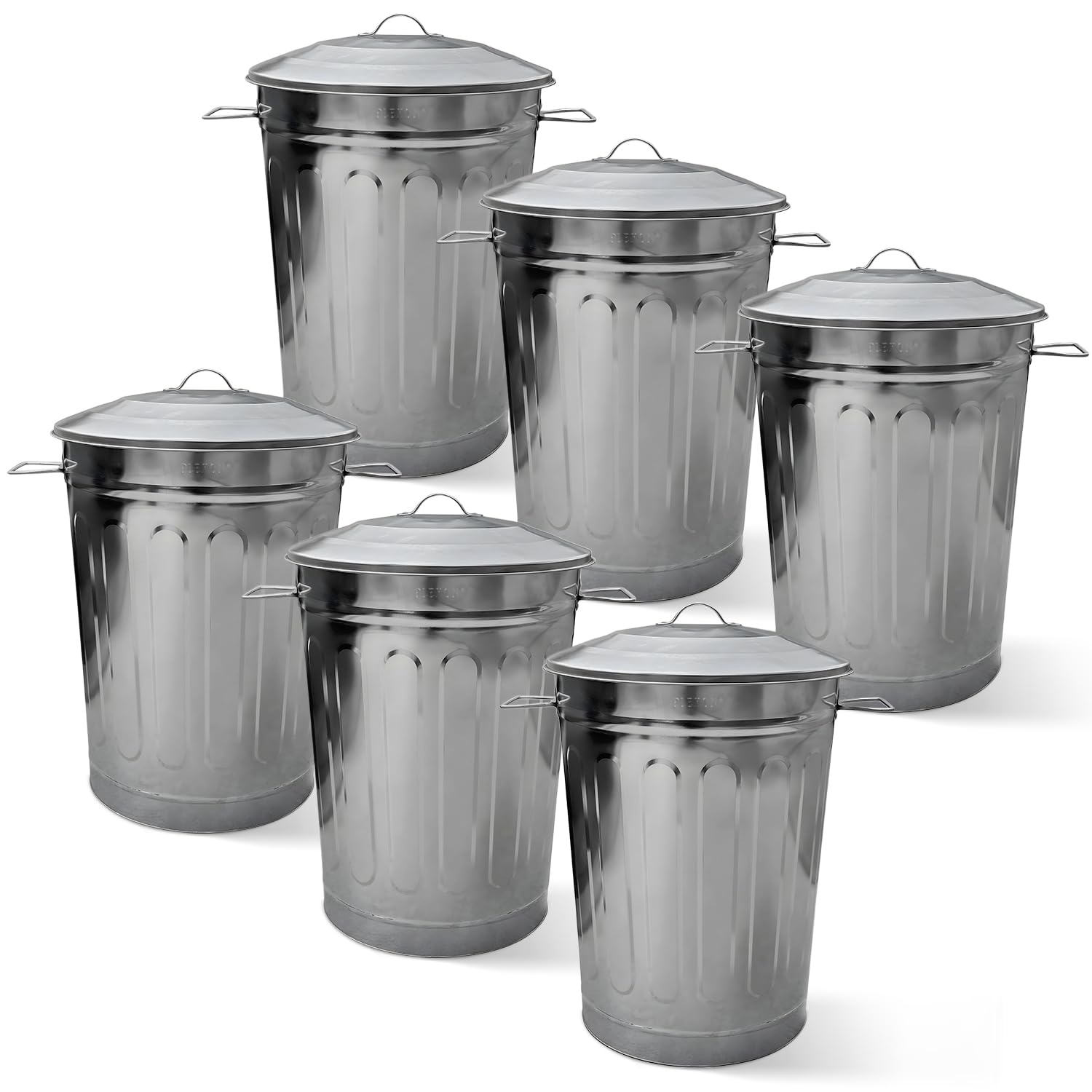 • Set includes: 6 x Plexon 13-Gallon Galvanized Steel Round Trash Can with Lid