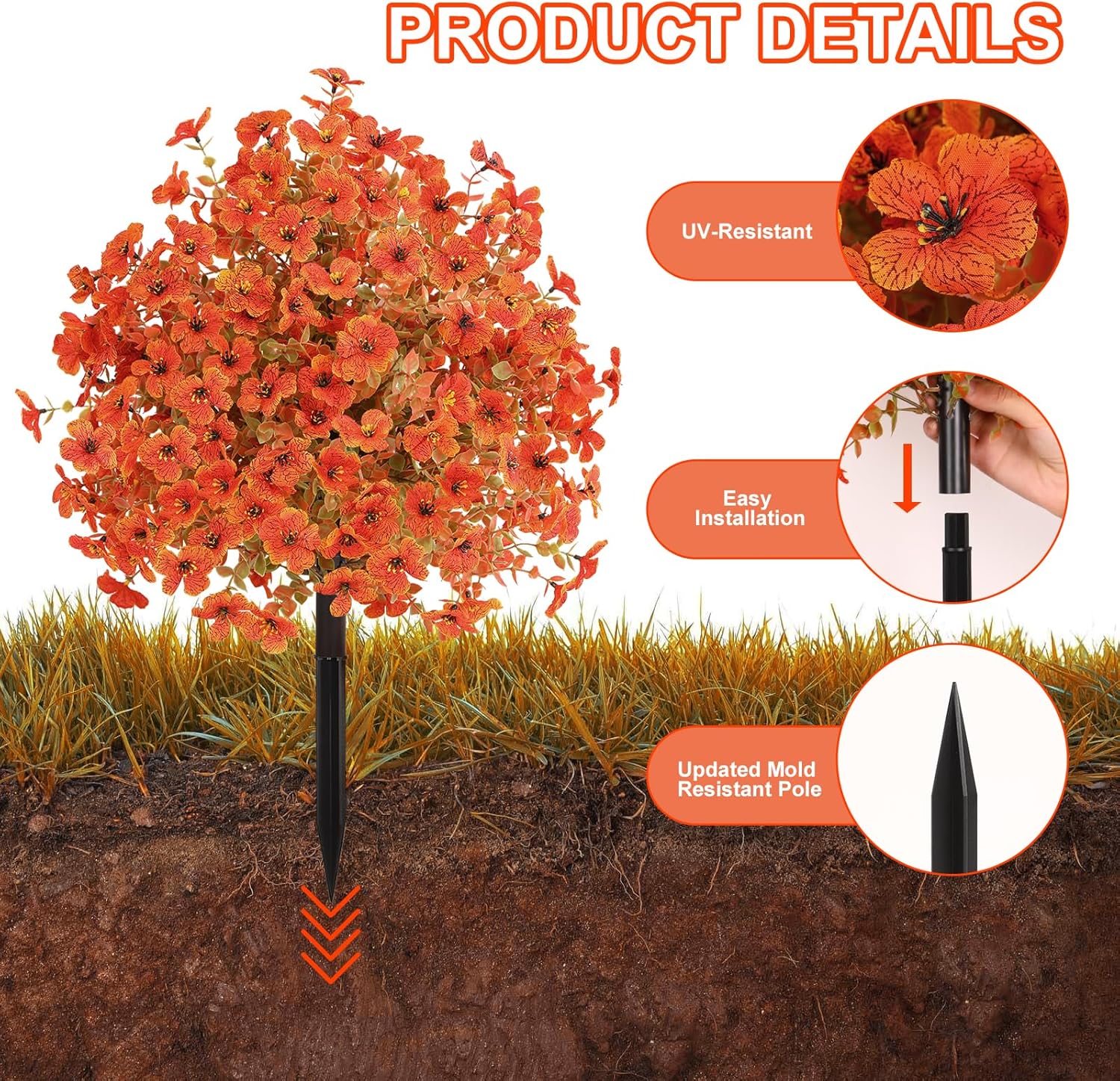• 🍂【Instant No-Tool Setup】 Transform any space in seconds! Just connect the two parts of greenery artificial fall flowers, fluff them into shape, and push the sturdy ground spikes into soil - no tools or assembly needed. Perfect for quick, seasonal decorating that's completely hassle-free."