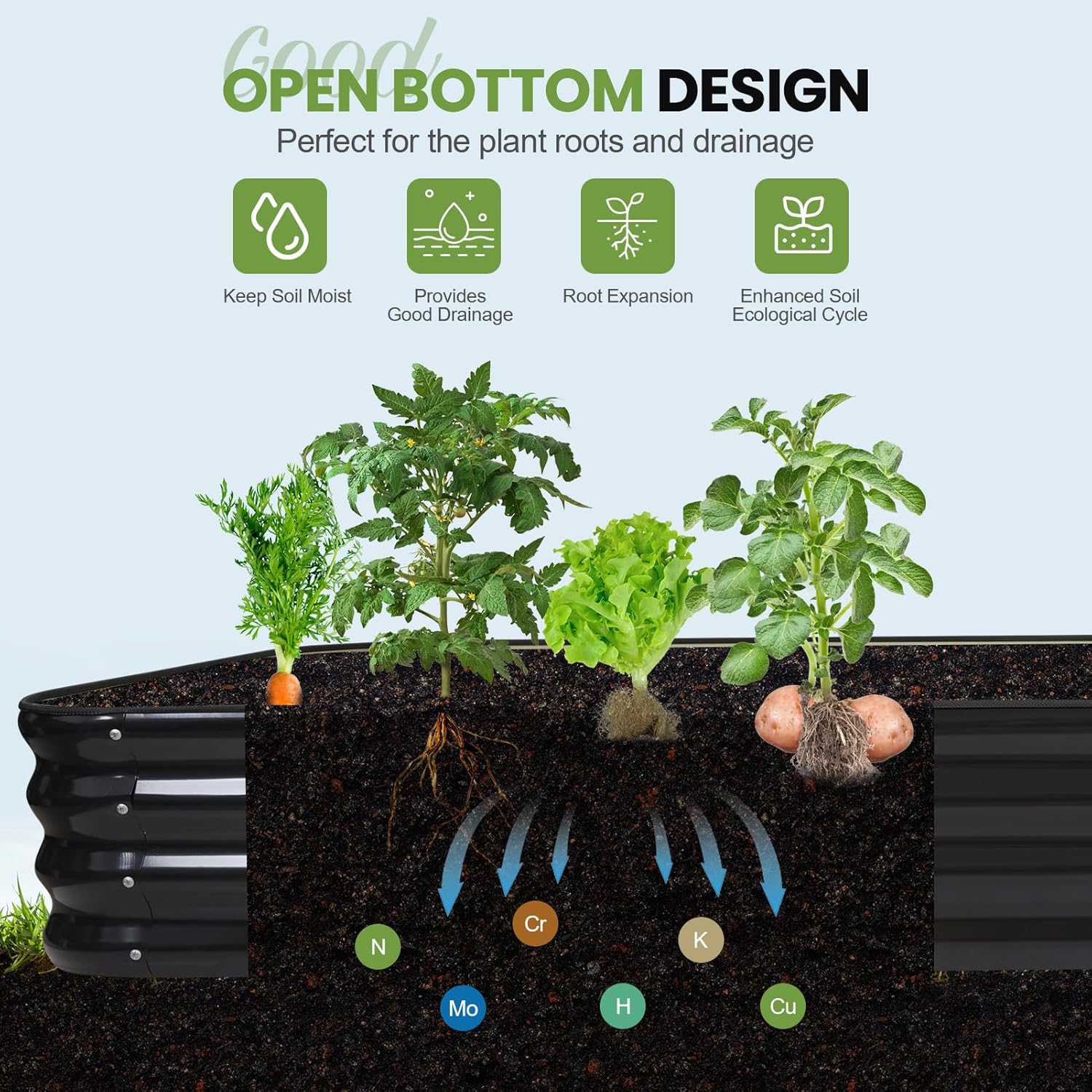 • Root-Friendly Drainage: Open-bottom design prevents waterlogging and root rot while promoting nutrient absorption. Made with galvanized materials to protect soil integrity, ensuring healthy growth of vegetables, herbs, flowers, and fruits