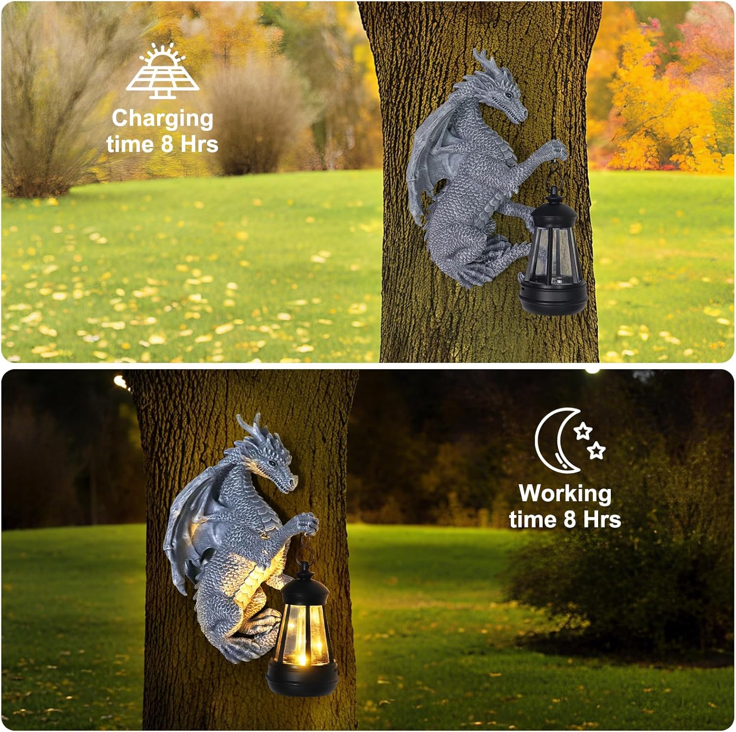 • Versatile dragon light for any outdoor spot! Hang this dragon wall decor on fences, pillars, porches, or trees—its back groove ensures secure placement, resisting wind. The solar-powered dragon light charges by day, glows bright all night, casting beautiful illumination. A functional dragon garden statue that shines as dragon wall art.