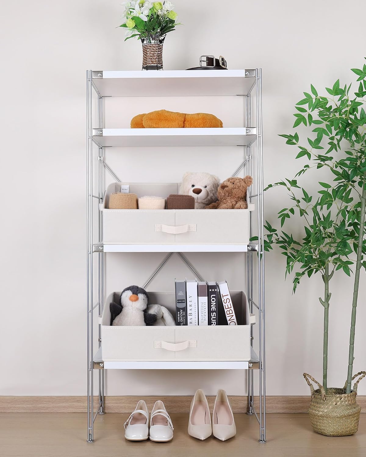 • Large Capacity & Sturdy Build: Measuring 19.5" (L) x 11" (W) x 8" (H/back) / 4.7” (H/front) with a 28L capacity, these closet baskets for shelves are reinforced with cardboard to resist deformation.
