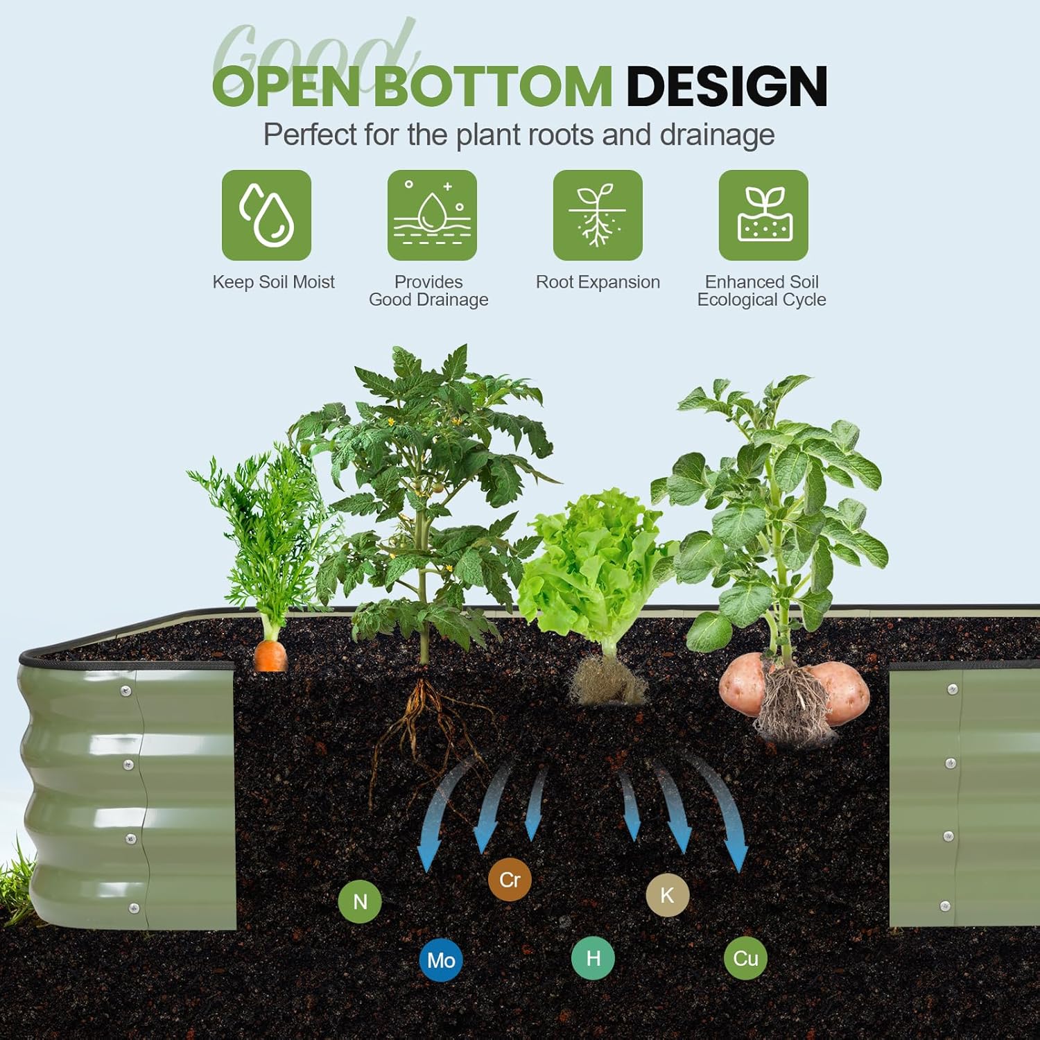 • Root-Friendly Drainage: Open-bottom design prevents waterlogging and root rot while promoting nutrient absorption. Made with galvanized materials to protect soil integrity, ensuring healthy growth of vegetables, herbs, flowers, and fruits