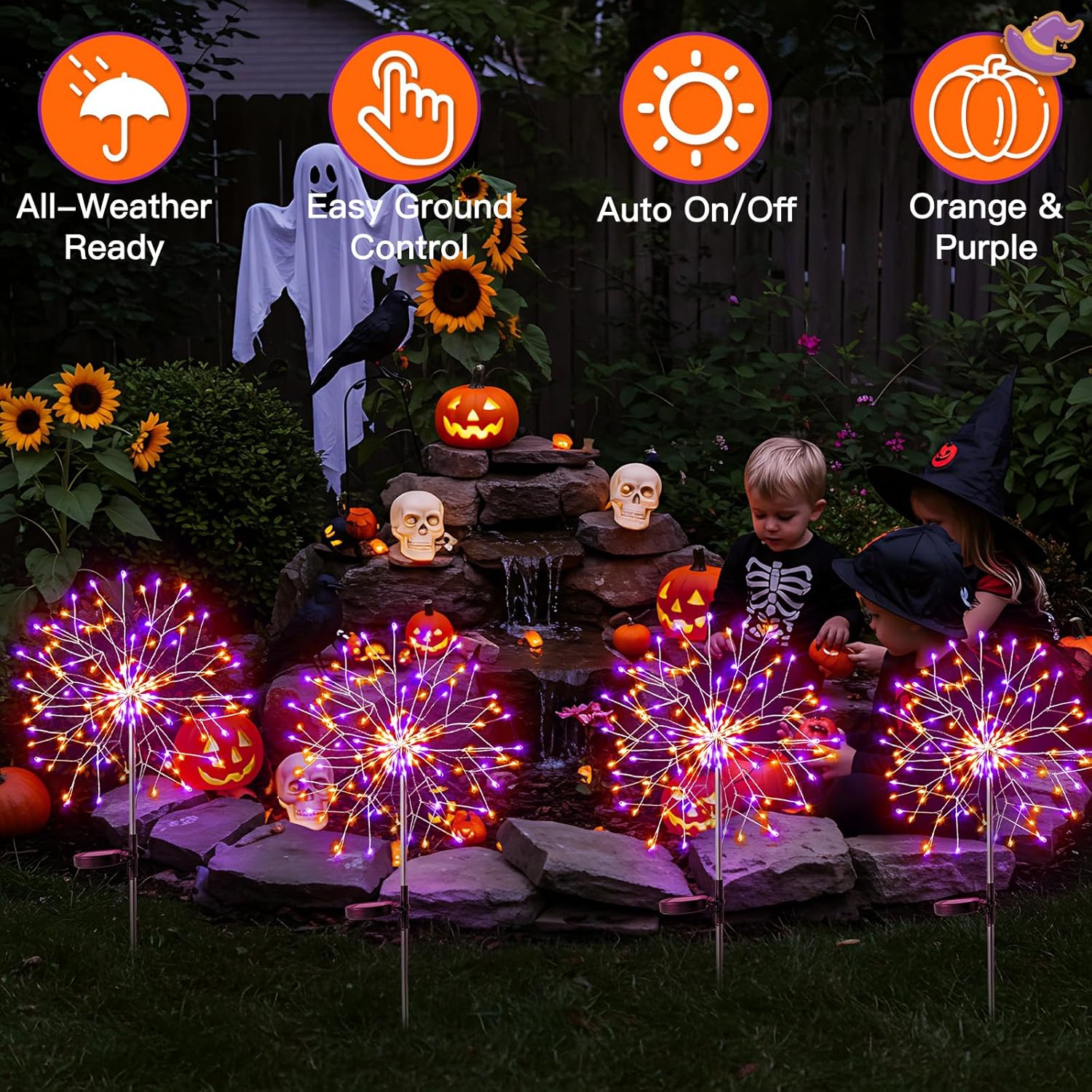 • 🎃【Orange & Purple Halloween Lights】 Cast a bewitching glow with our exclusive Orange and Purple solar lights, designed for the ultimate Halloween decorations. These solar powered firework lights create a unique, spooky atmosphere that standard lights can't match. Perfect for making your yard the most eye-catching on the block for trick-or-treaters and party guests.