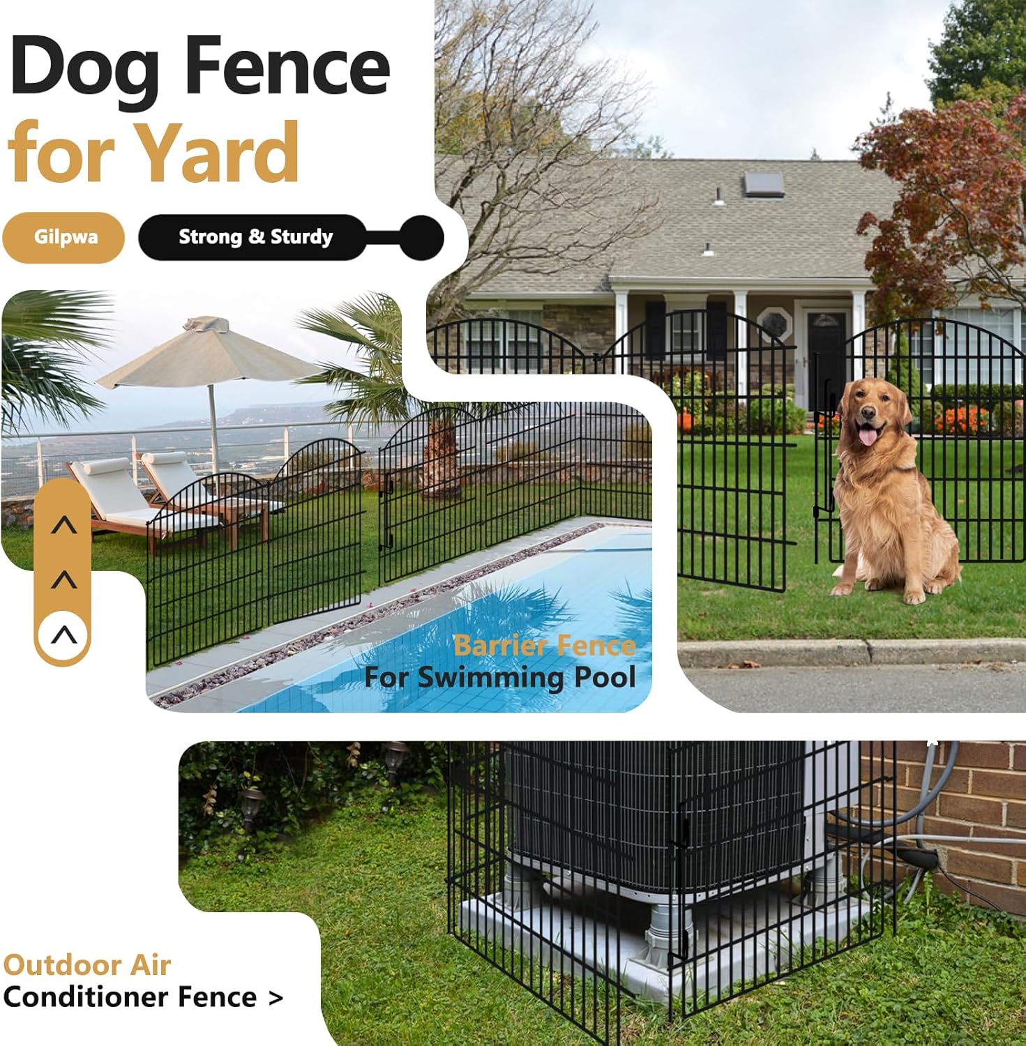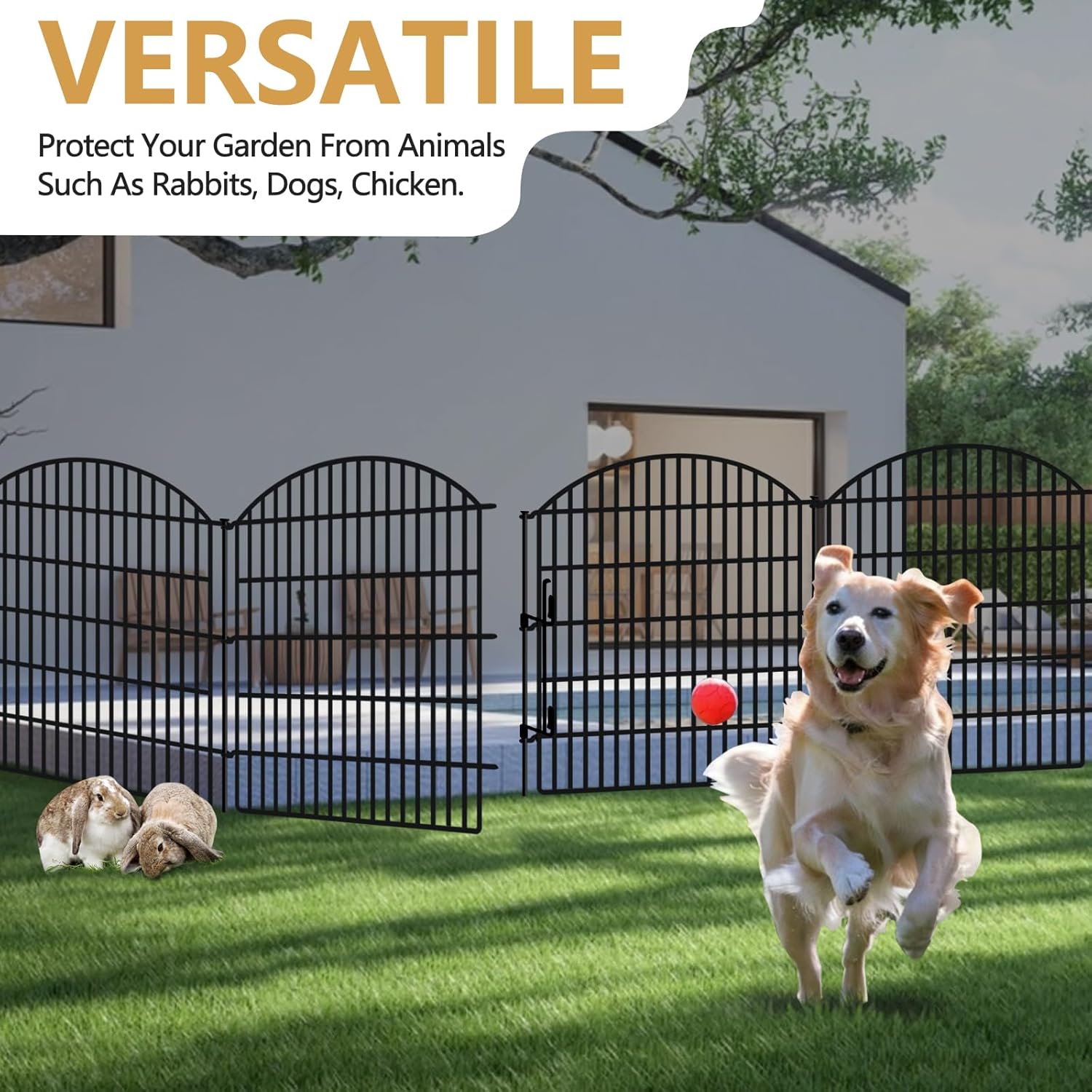 • MORE AVAILABLE SIZE: The classic arch shape design garden fence single piece measures 29" wide, 33" high, 1.4" gap. Comes with 17 metal stakes are 44" in height, which can be inserted into about 12.6 inches above the ground, making it strong enough to prevent animals from entering & leaving, dog digging, and even keep rabbits away from your plants. A total of 16 fence panels with a lock, connecting 17 fence stakes, the total length of the garden fence is approximately 38.67 ft.