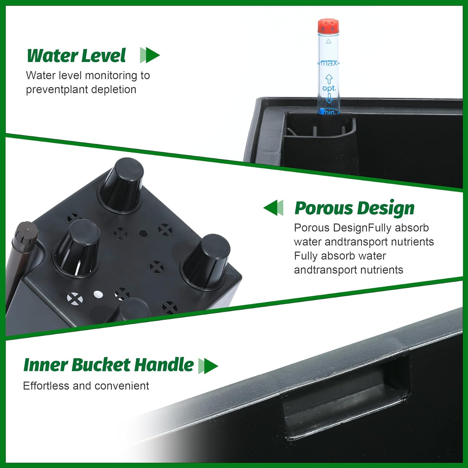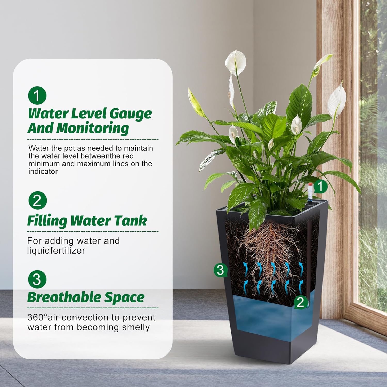 • Automic Watering System: Each tall black planters comes with built-in drainage holes and a sink to ensure that your greenery absorbs water smoothly and minimizes root rot. When the water level is low, the automatic watering system kicks in to provide your plants with the necessary moisture with minimal effort