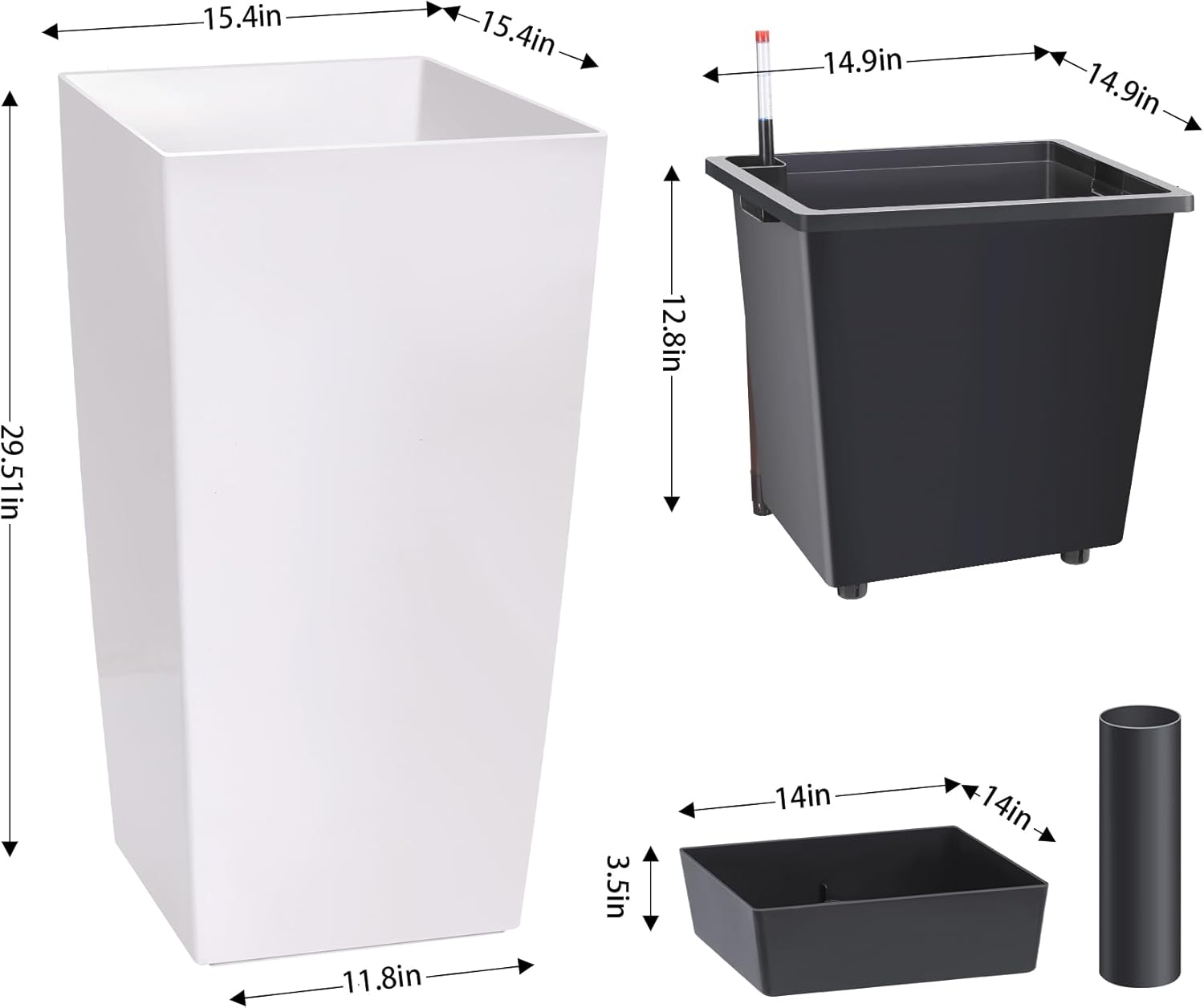 30" Tall Planters Set of 2, Outdoor&Indoor Black Planter Pots, High Front Porch Planter Pots with Drainage Holes&Water Level Monitor Movable Wheels &Inner Bucket, Automatic Watering, White
